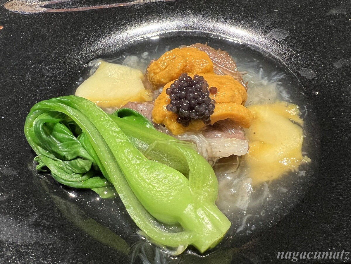 合い肴 自家製柔らか牛タンのふかひれあんかけ、蝦夷鮑、生雲丹、キャビア、ミニ青梗菜
