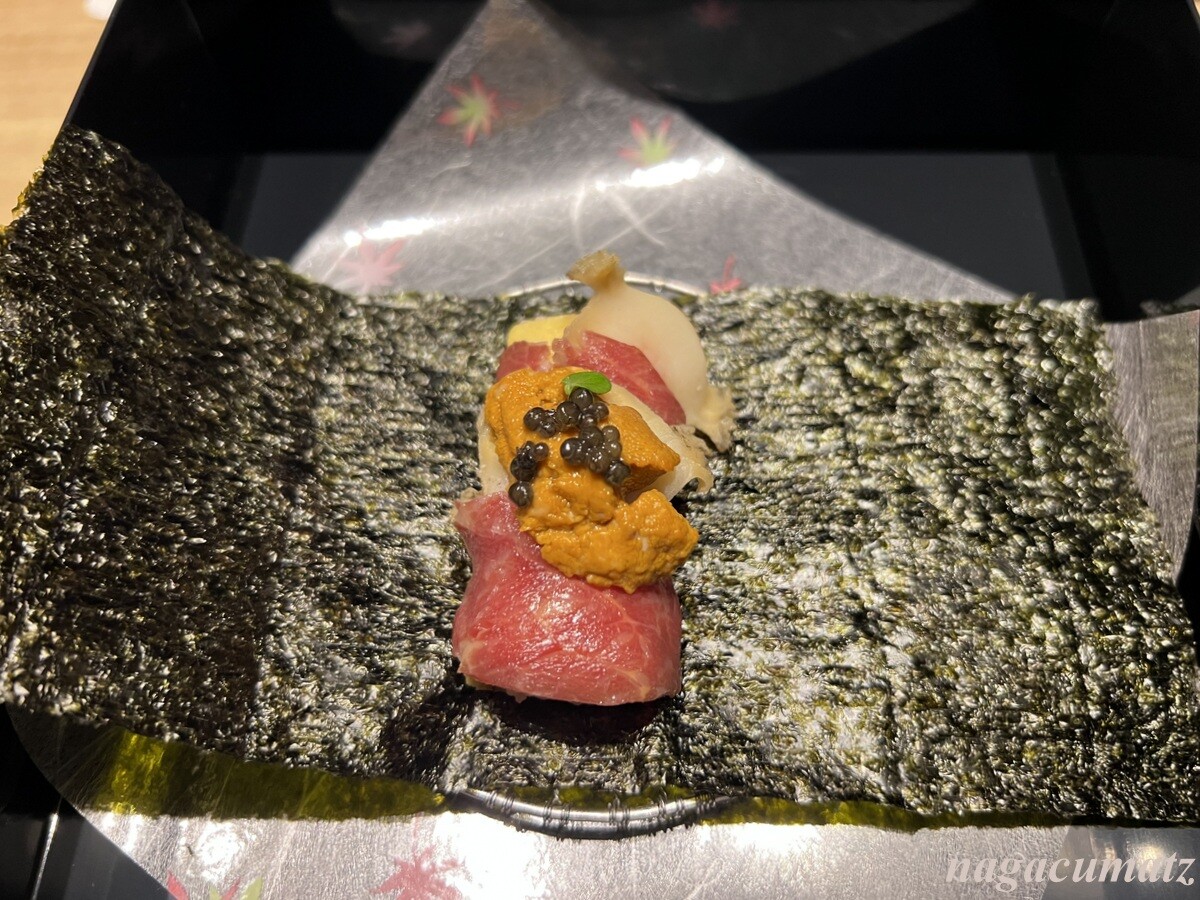 お凌ぎ 蝦夷鮑と馬霜降り肉手巻き寿司 キャビアが載る。海苔を巻いていただく。