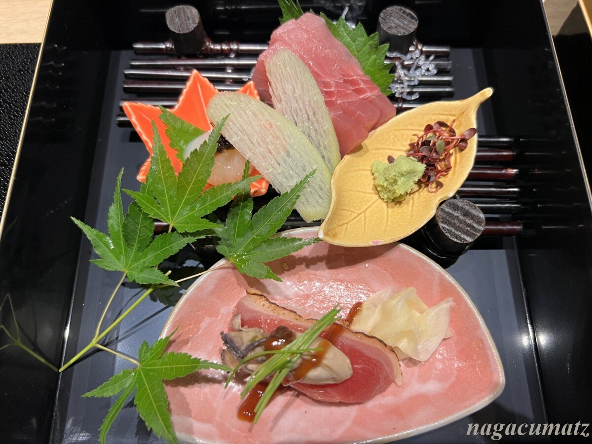 お造り 牡蠣と熟成生鴨握り寿司、三崎産まぐろ、帆立貝柱昆布締め 菊芋などがつく。