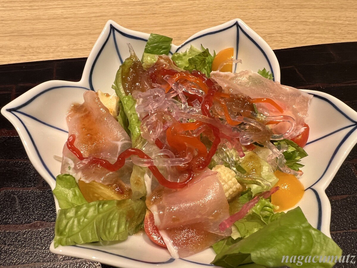 サラダは、生ハムクリームチーズサラダ ミニトマト、ヤングコーン、海藻麺