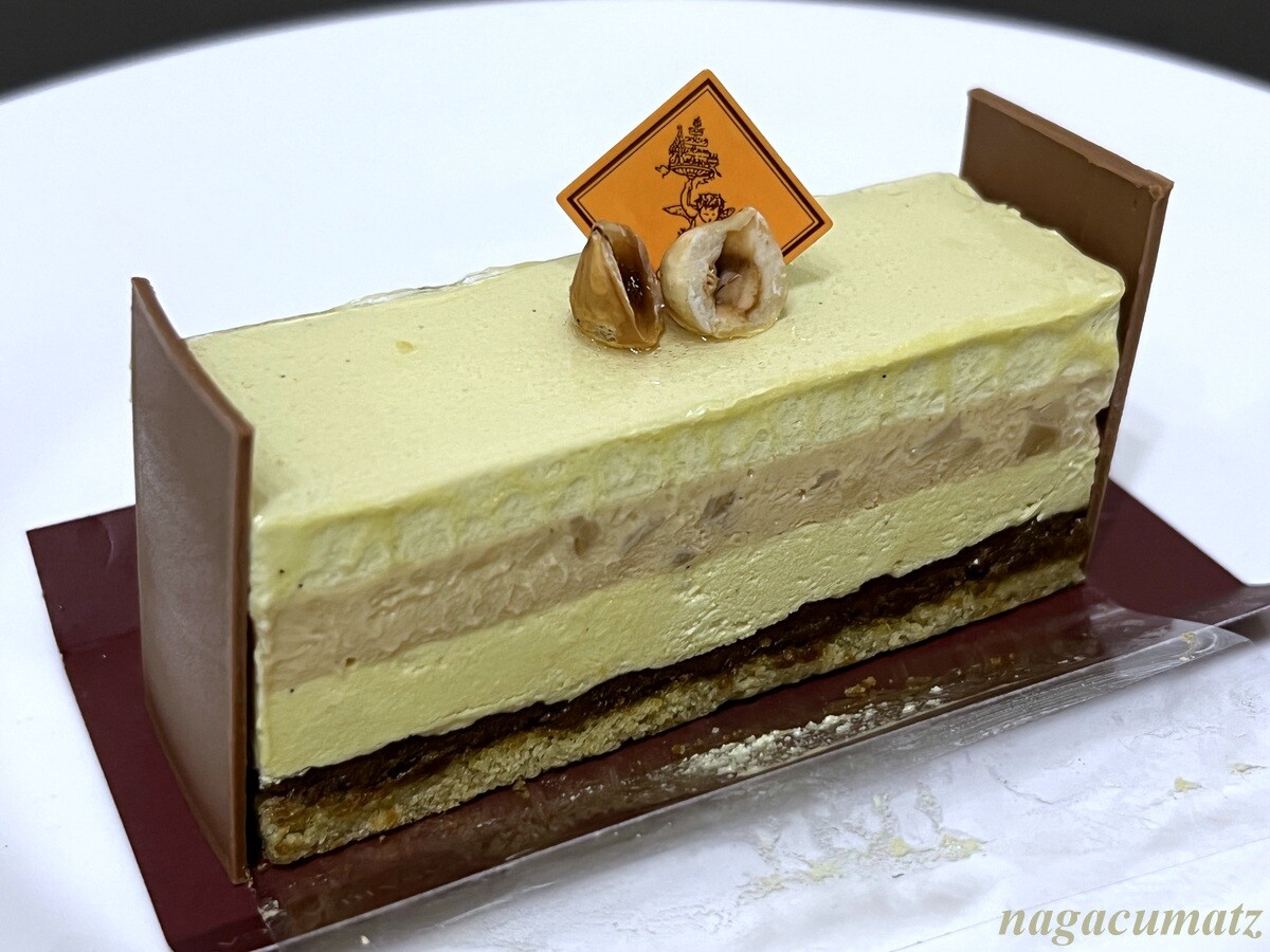 ピスタチオのパンドジェンヌ(アーモンドプードルをたくさん使った生地)に、ヘーゼルナッツのフィユティンヌ(クレープ状に薄く焼いた生地)、ピスタチオのムースリーヌ(カスタードクリームにバターを加えたもの)、ヘーゼルナッツのクリームを重ねたもの。ヘゼルナッツクリームの中にはヘーゼルナッツがプツプツと入り、食感も良い。ピスタチオもヘーゼルナッツも濃厚で非常に美味しい。