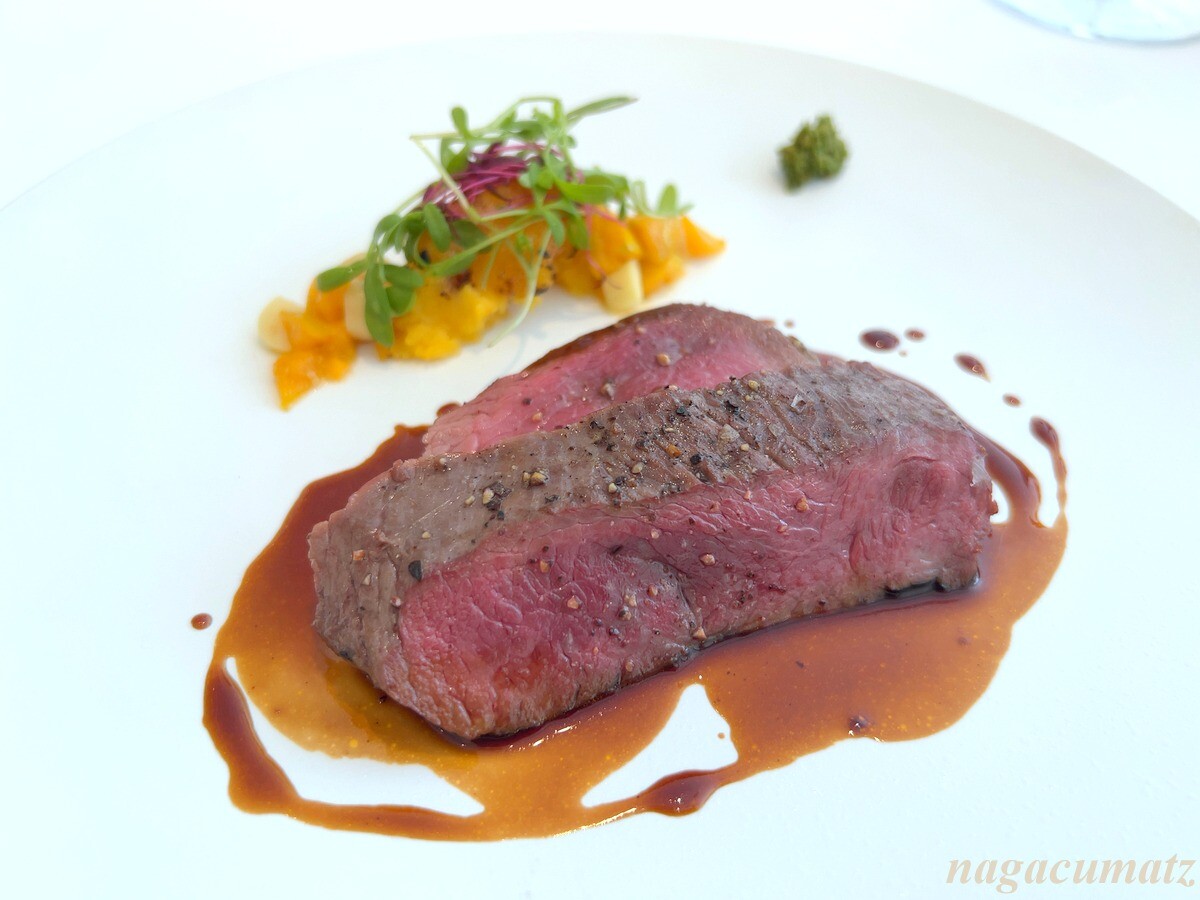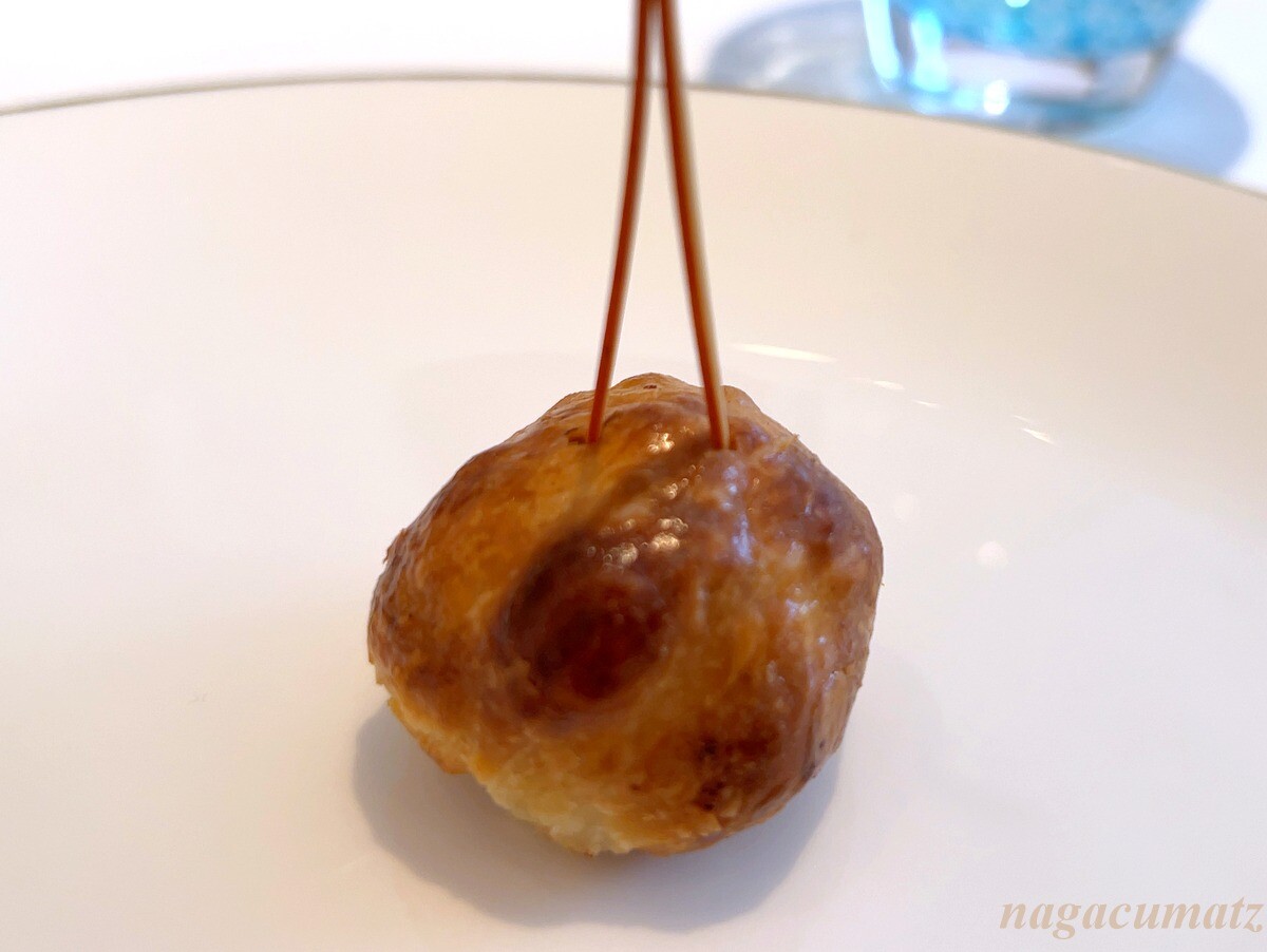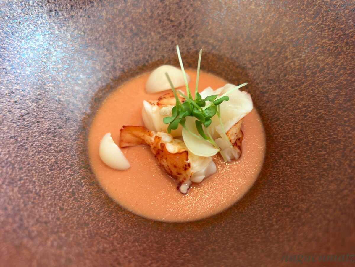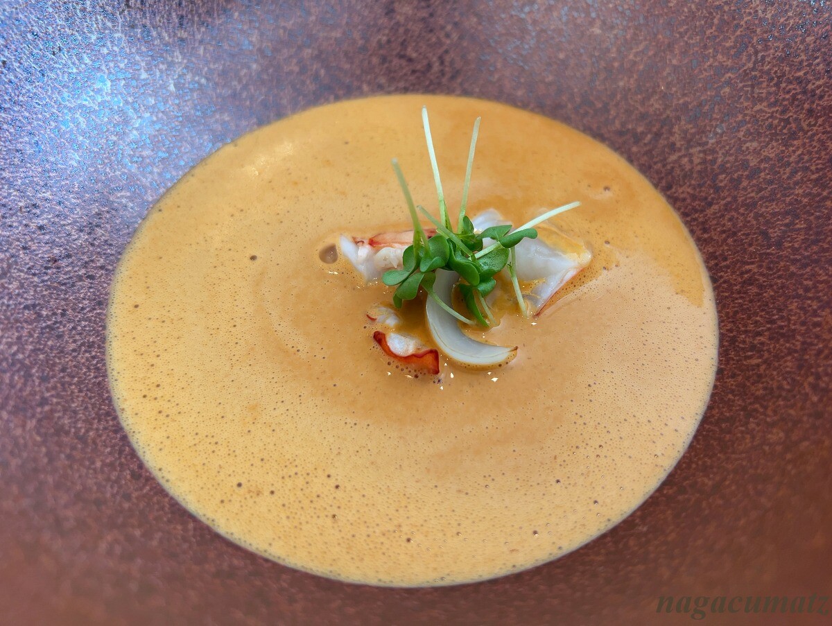 オマール海老のビスクには百合根やトマトが入ったムースのようなものの上に、スープをかけてくださるので、それを混ぜていただく。美味しい!