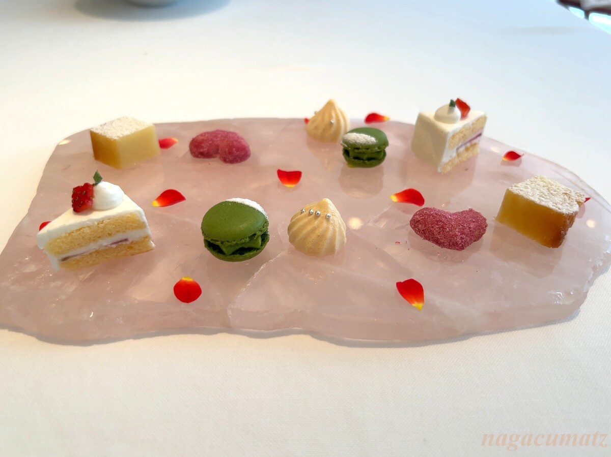 余韻として、小菓子。ショートケーキ、抹茶のマカロン、アプリコットのメレンゲ、フランボワーズのクッキー、ホワイトチョコレートのガトーショコラ。小さいがとても丁寧に作ってあり美味しい。