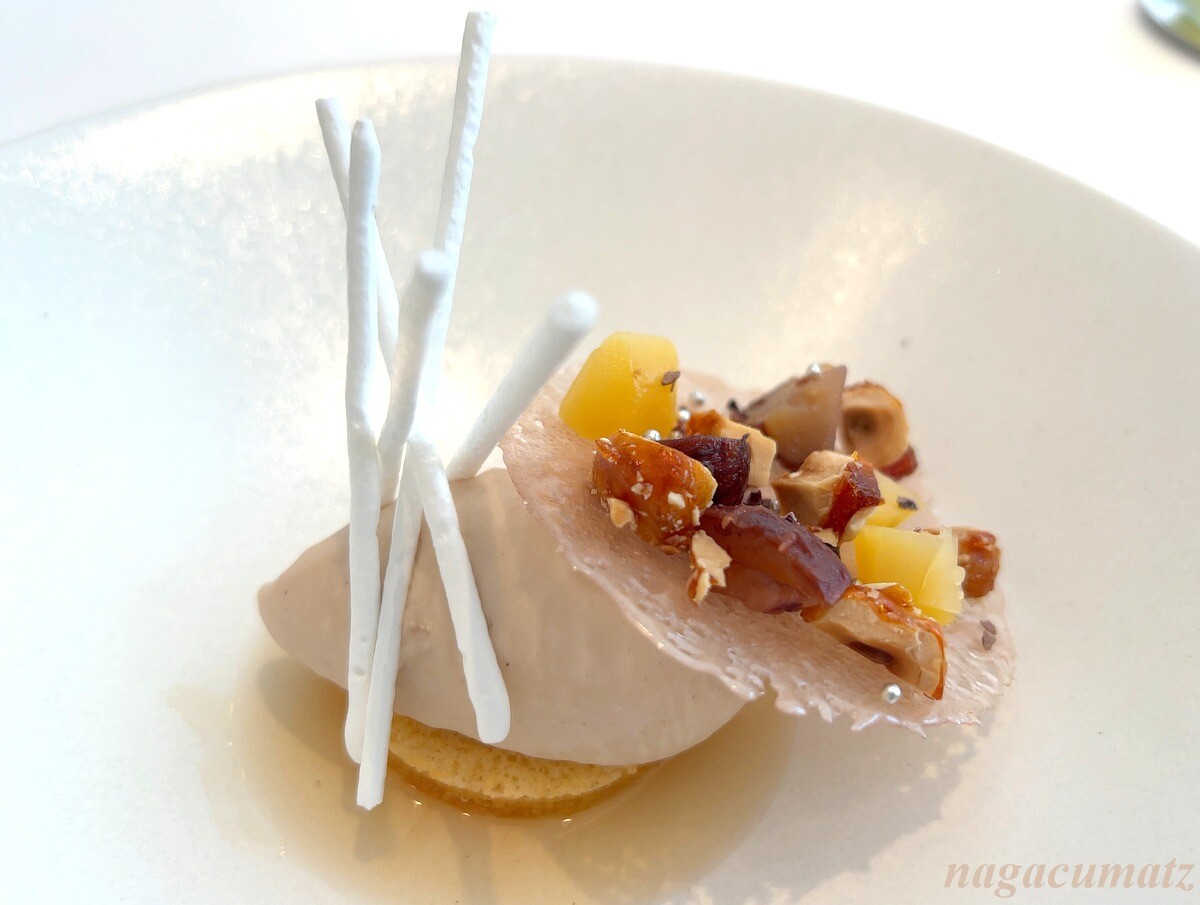 白いものはメレンゲ、薄焼きの上には栗の渋皮煮、甘露煮、ヘーゼルナッツが載る。