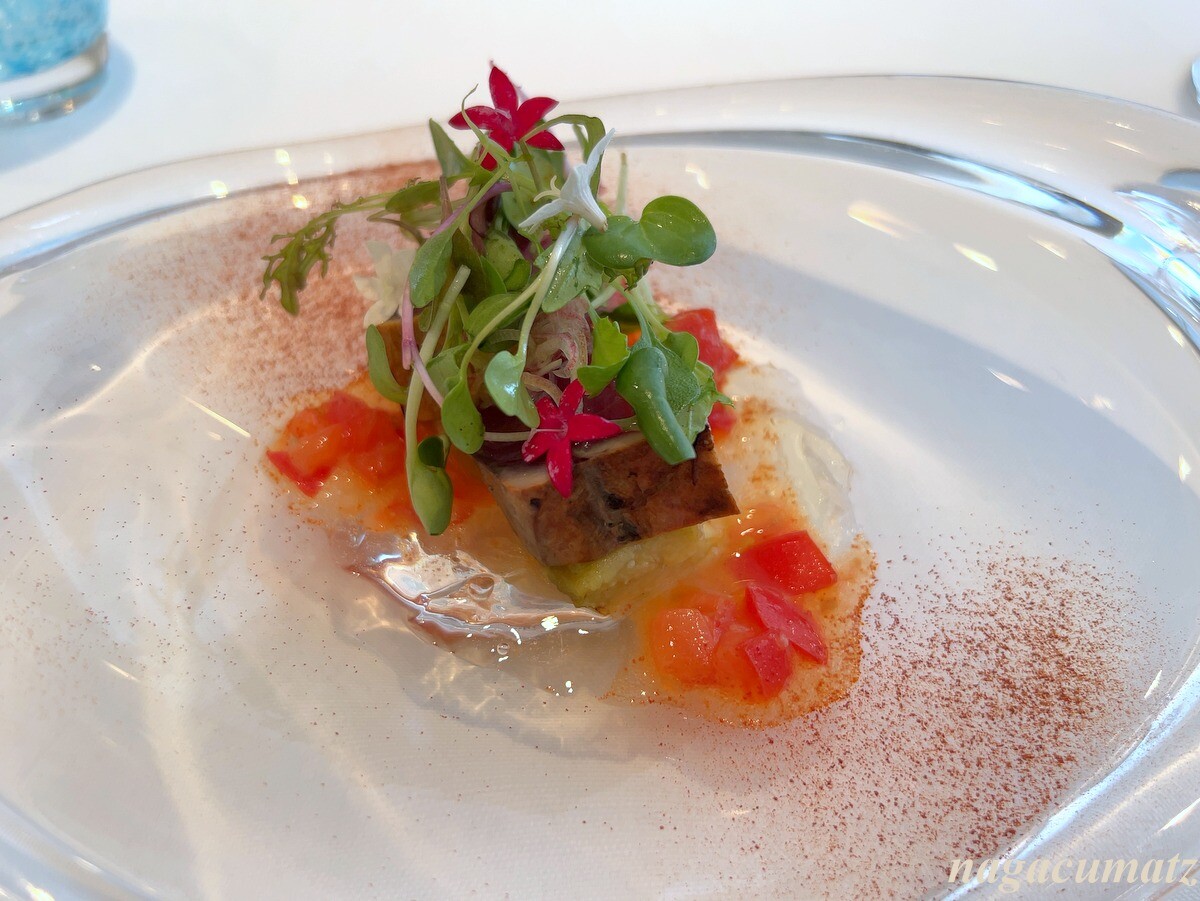 気仙沼産の戻り鰹の燻製、下には焼き茄子、上には茗荷など、鰹のパウダーなど。