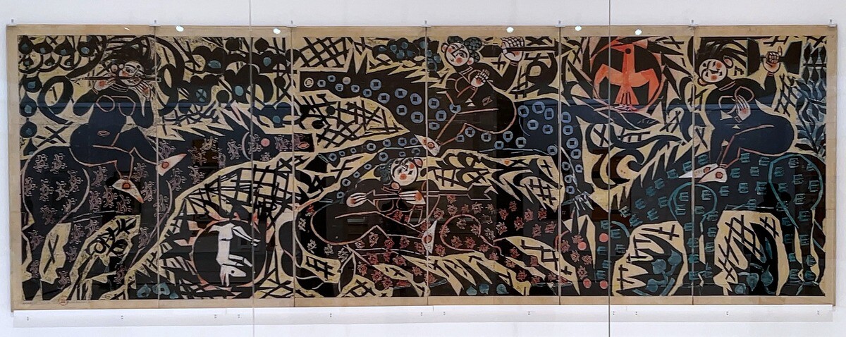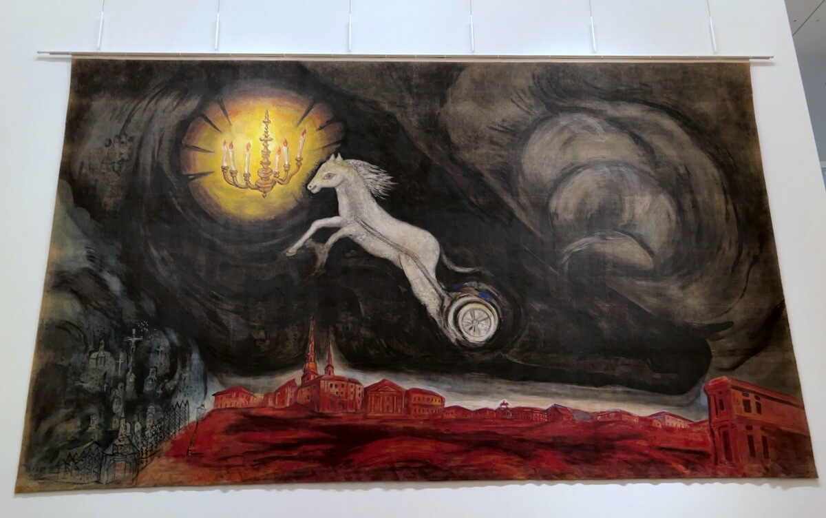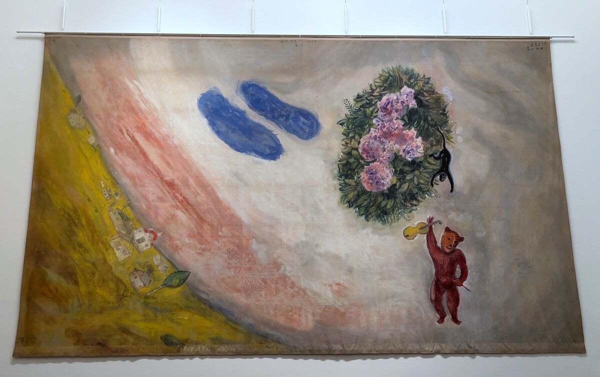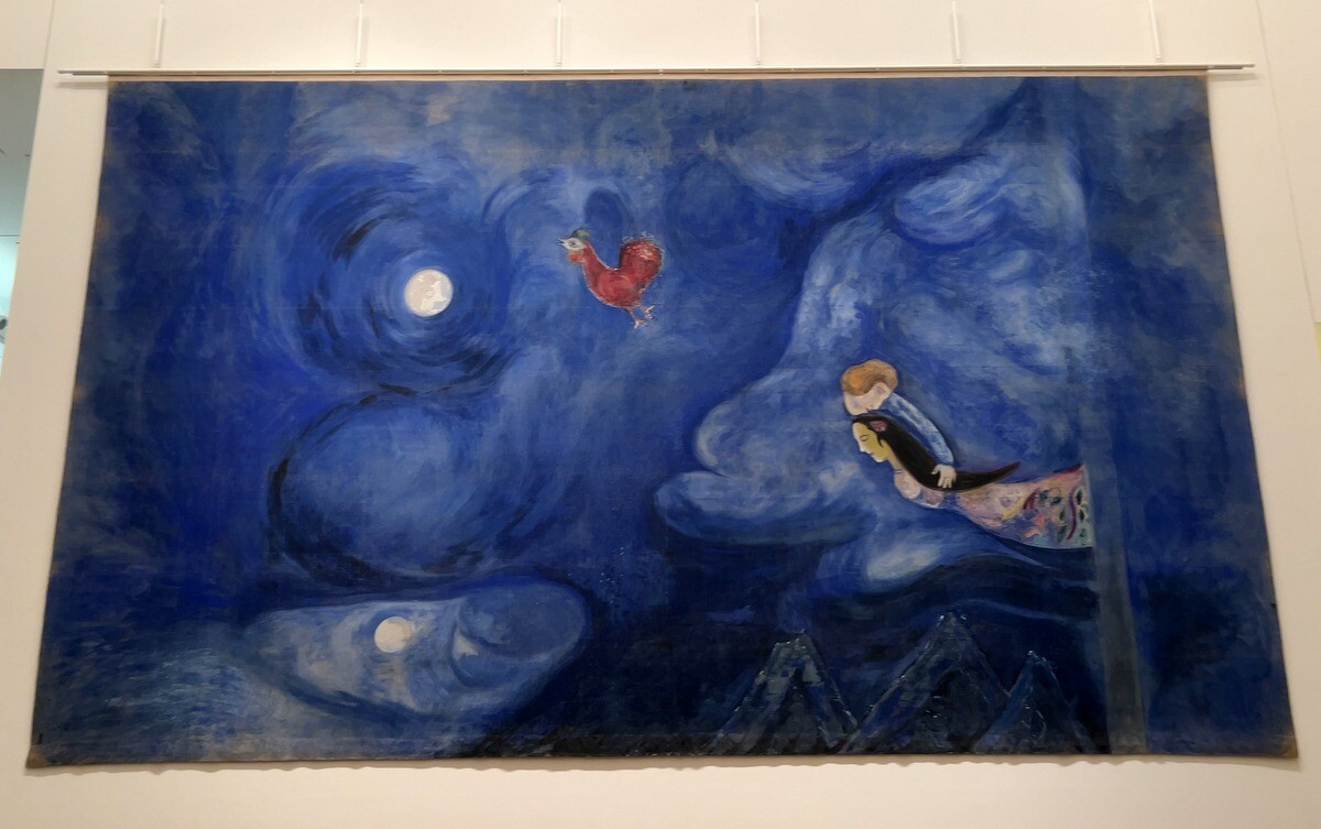 バレエ「アレコ」は、ロシアのアレクサンドル・プーシキンの詩「ジプシー」を原作とする物語。バレエ音楽はチャイコフスキー、振り付けをロシア出身のレオニード・マシーンが行い、シャガールは、背景画だけでなくダンサーの衣装もデザイン。1942年に初演。1960年代後半まで上演の度に用いられ、1977年にアメリカンバレエシアターが手放したと言う経緯。