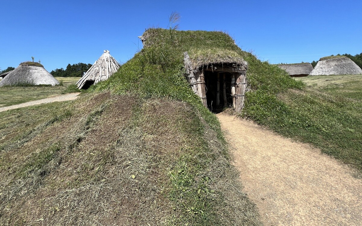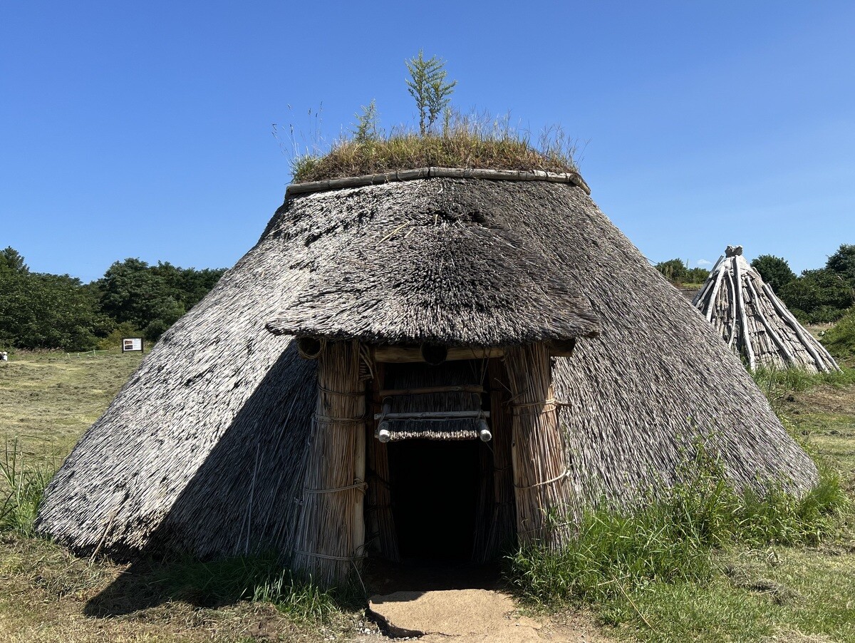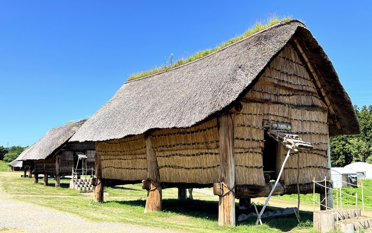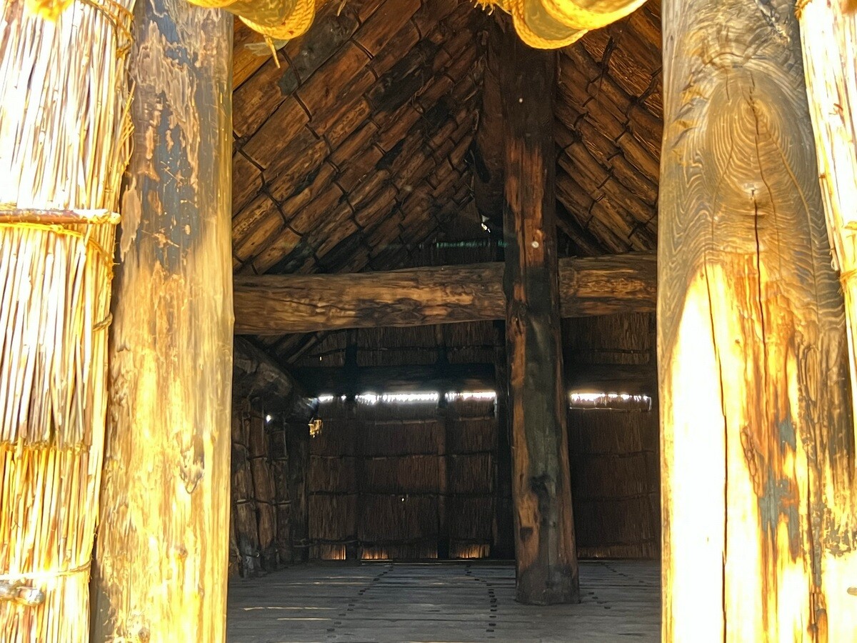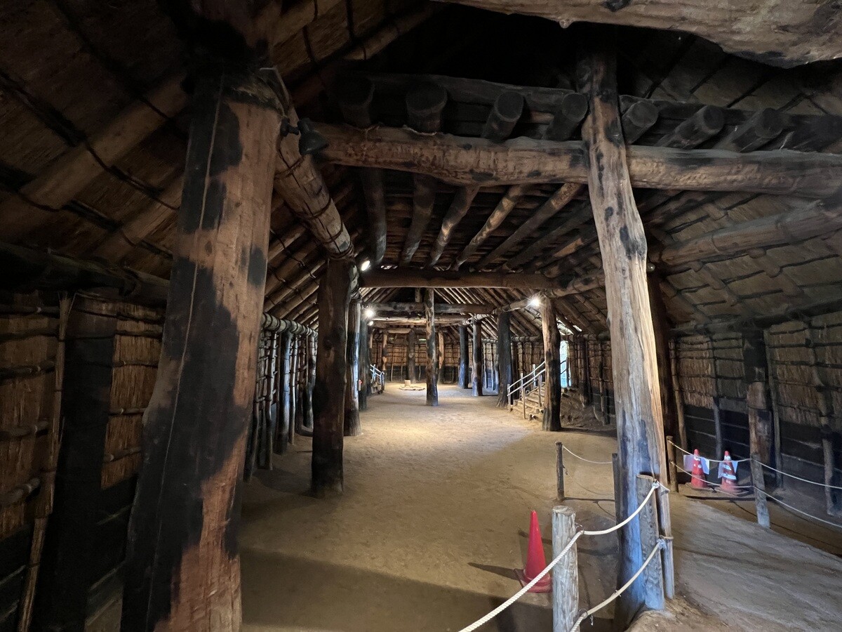 大型竪穴建物(復元)長さ32メートル、幅約10メートル、95坪もあるワンルーム。炉もあるが、集会所か共同生活の宴の場所かと推測される。