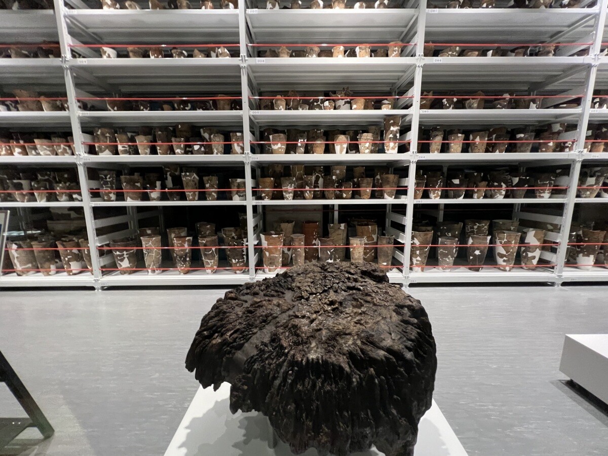 地下には、一般収蔵庫があり、高さ約4メートルの棚に、土器を収蔵する様子が公開されている。
