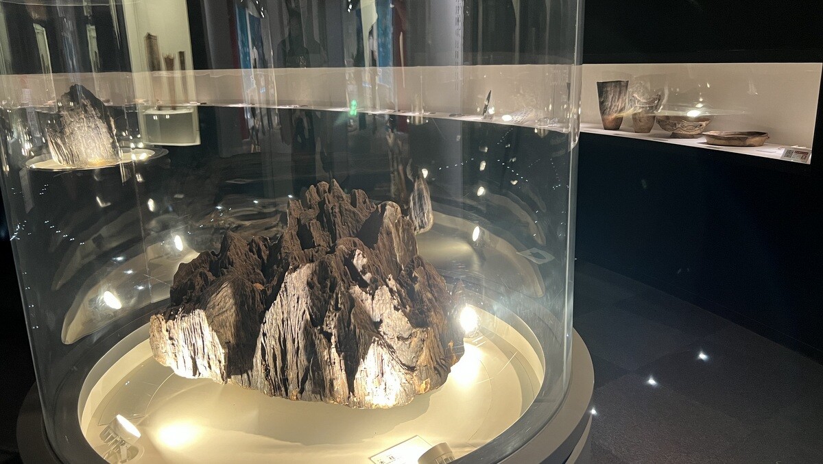 編籠(重要文化財)縄文時代前期 紀元前3800年 高さ16センチ、幅10センチの編籠は、ヒノキ科の針葉樹の樹皮を縦横に組んだ網代編み。中からは半分に割れたクルミの殻が見つかり、低湿地の捨て場から出土。水分が多く空気から遮断されたまま埋まっていたので、5800年間分解されずに残っており、大きさや形が立体的にわかる編籠としては全国で唯一のもの。