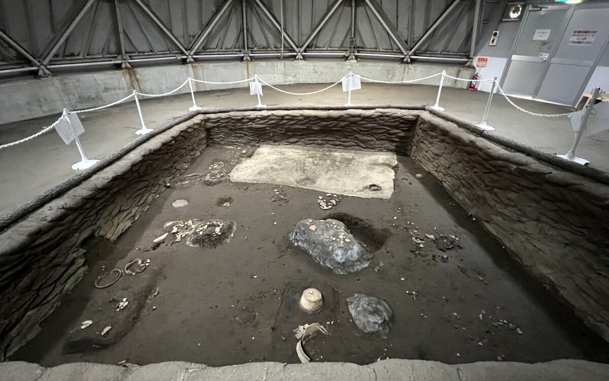 北盛土 発掘調査された当時のままを展示しており、敷き詰められたような土器は縄文時代中期(紀元前約3000年)のもの。