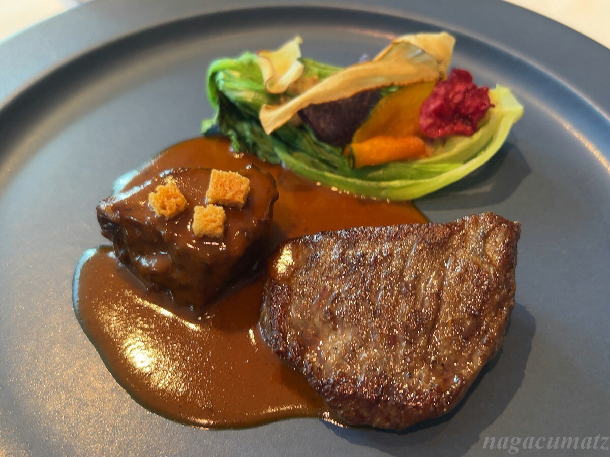 牛ホホの煮込みと牛リヴのロースト、根菜のグラタンとチップス サラダ菜