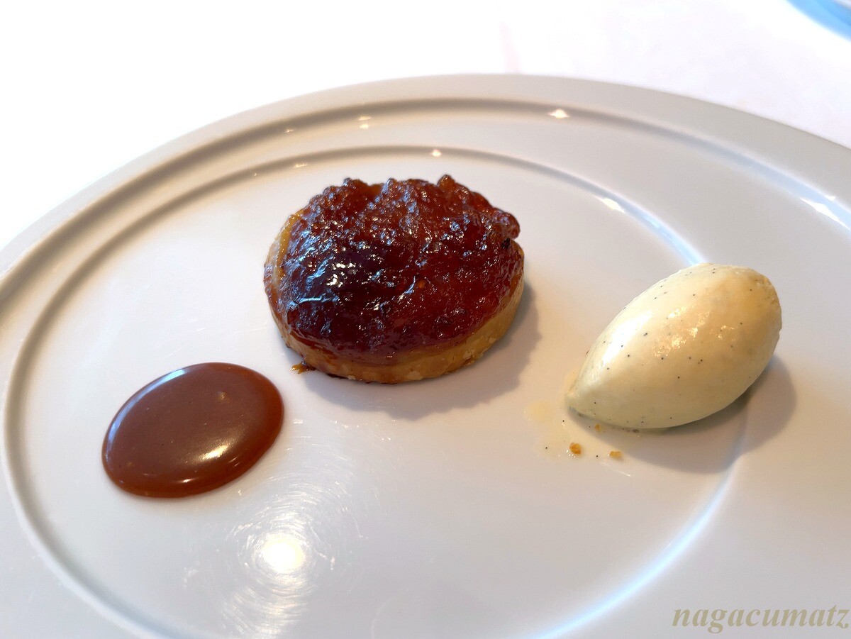 本日のデザートは、チョコレートムースとタルトタタンからの選択で、タルトタタンを。バニラアイスクリームと、濃厚なキャラメルが付く。