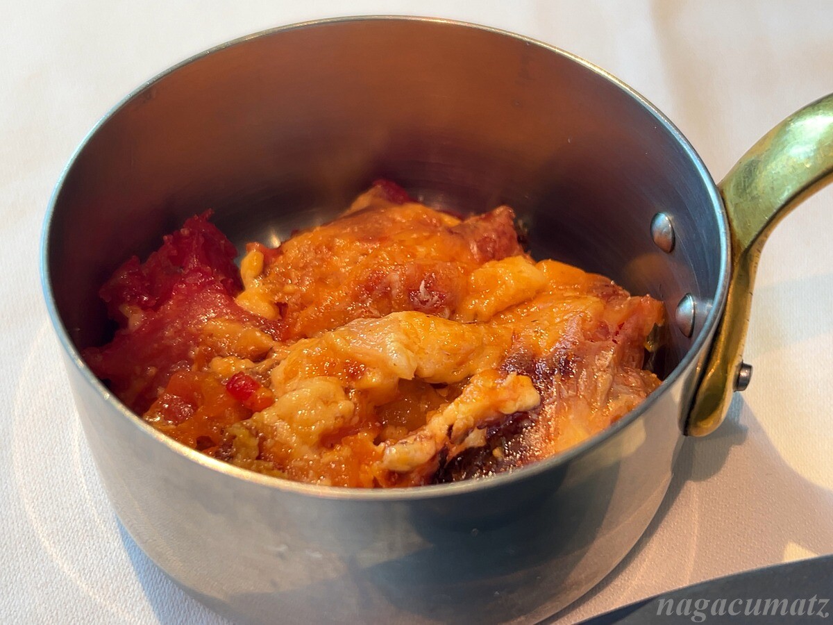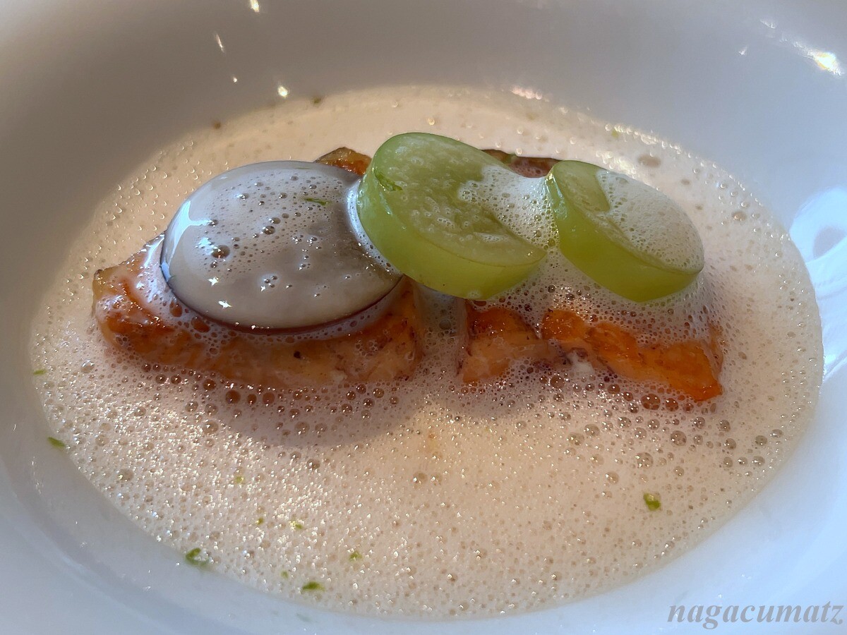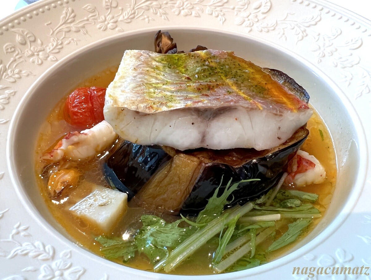 ふわふわのイトヨリの下には茄子、ムール貝はモンサンミッシェル産。揚げ茄子からの油がサラッとしたスープに奥行きを与えているイメージ。美味しい。