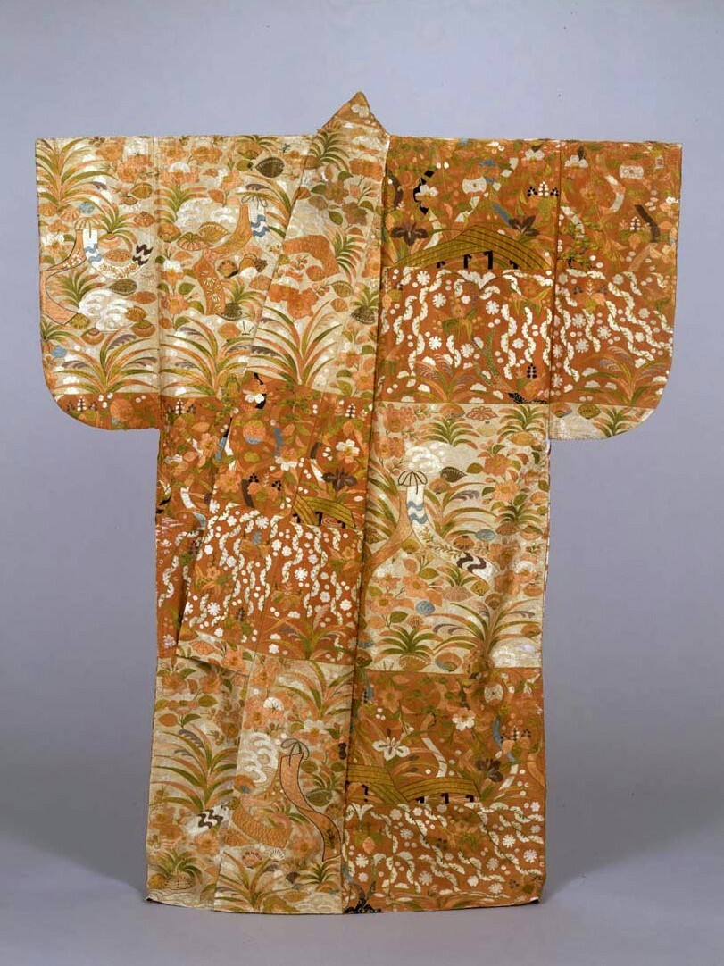 「縫箔 紅白段草花短冊八橋模様」 桃山時代16世紀