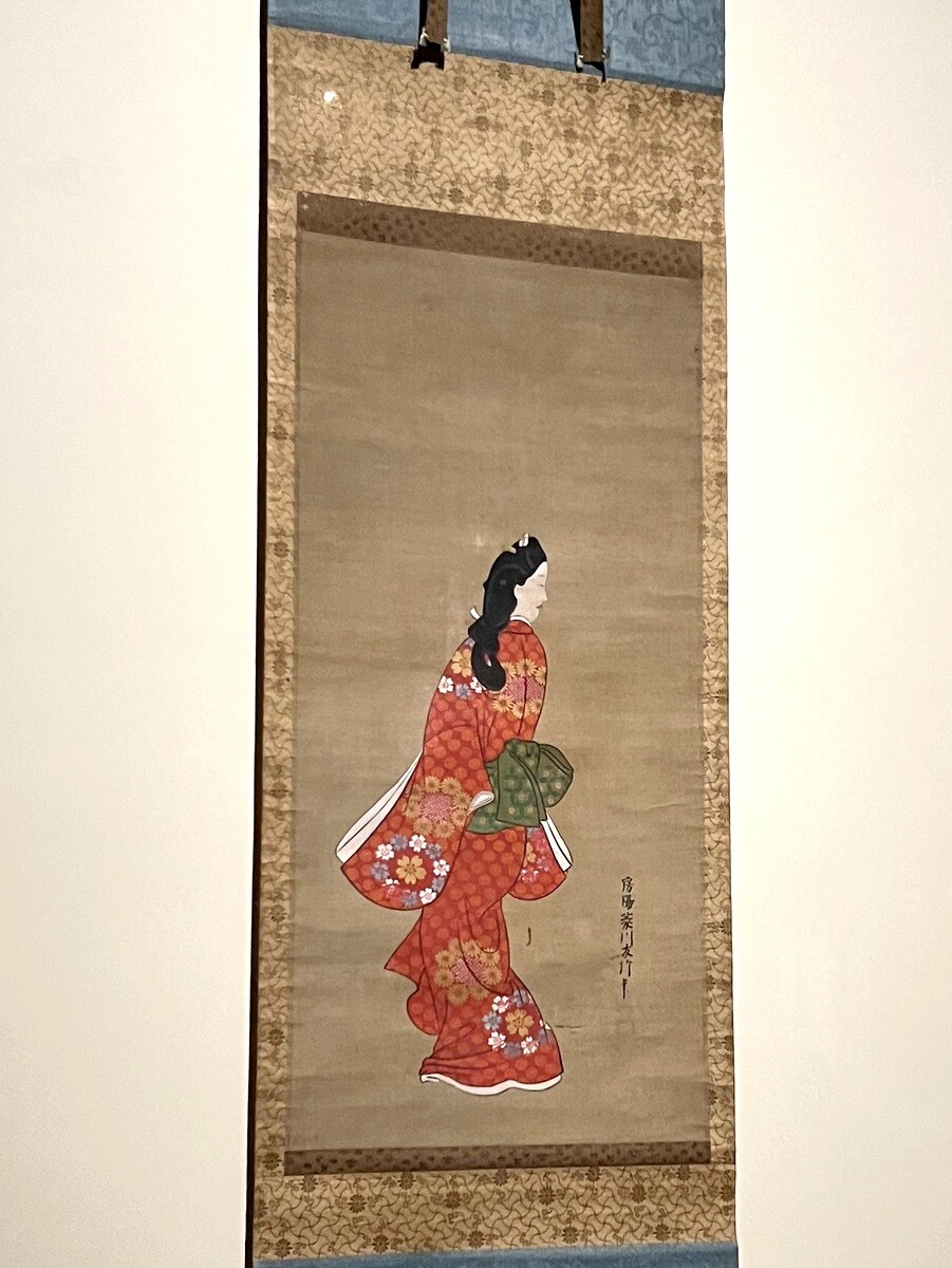 非常に有名だが国宝ではない。肉筆画の傑作で、髪型が玉結びという当時流行していた結び方。帯は吉弥結びと言い、上村吉弥という歌舞伎役者が考案した。人気の花模様の着物で、女性を呼び止めて振り返ったところは、前からは見えない最新の流行を強調する為のポーズを取っている。当時は未だ珍しかった歌舞伎や遊郭を描き、浮世絵と名付けられ、浮世絵の祖とも言われていた。