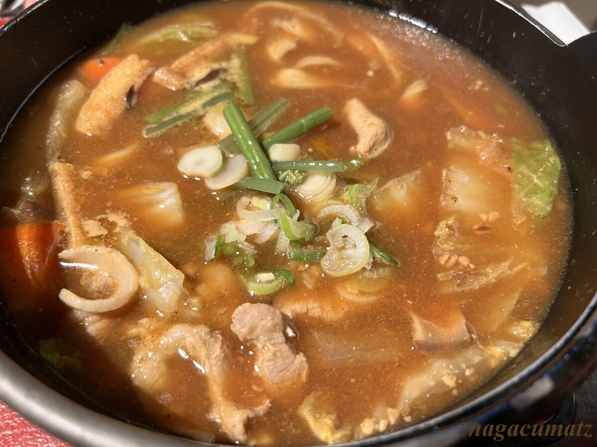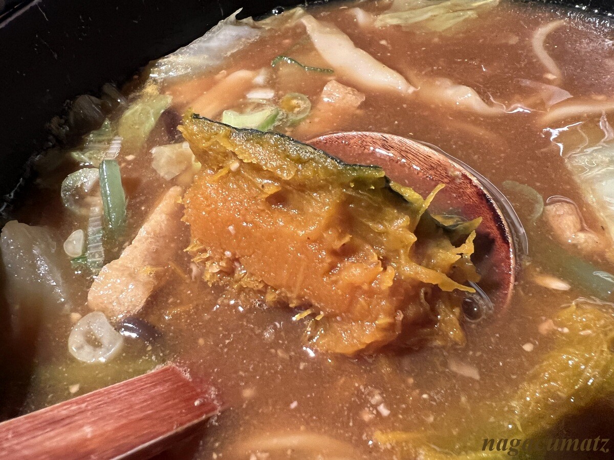 どちらにも、良く煮えた大きな南瓜がゴロンゴロンと入っている。人参や大根はちょっと硬めと思っていたが、徐々に熱が伝わって程良くなっていった。厚揚げ、白菜、葱、ぜんまいなどが入る。