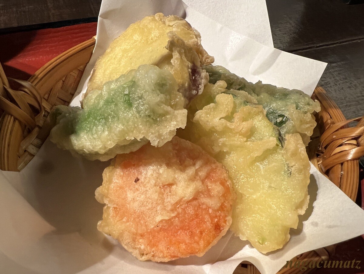 天ぷらは、人参、ししとう、ズッキーニ、サツマイモ、ピーマン。