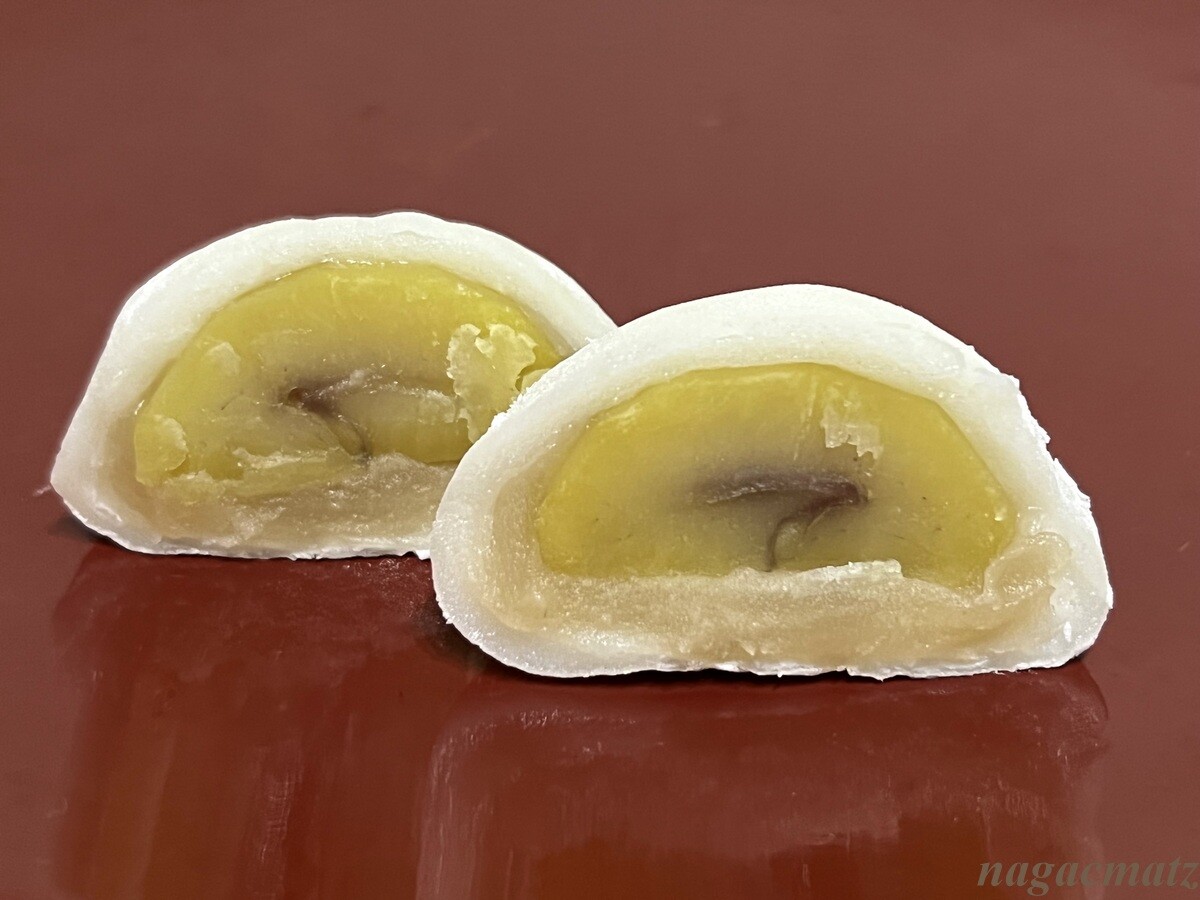 粒栗大福 350円 一粒栗の甘露煮を白餡で包んでいる。大福の生地がもう少し柔らかい方が好みかも。