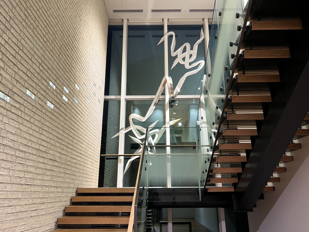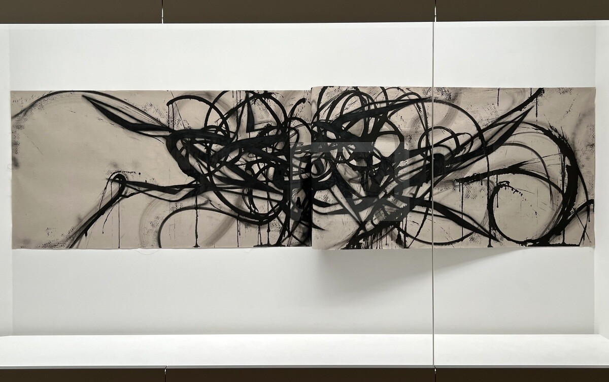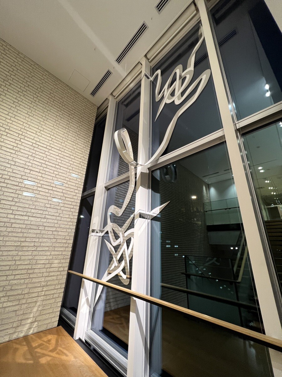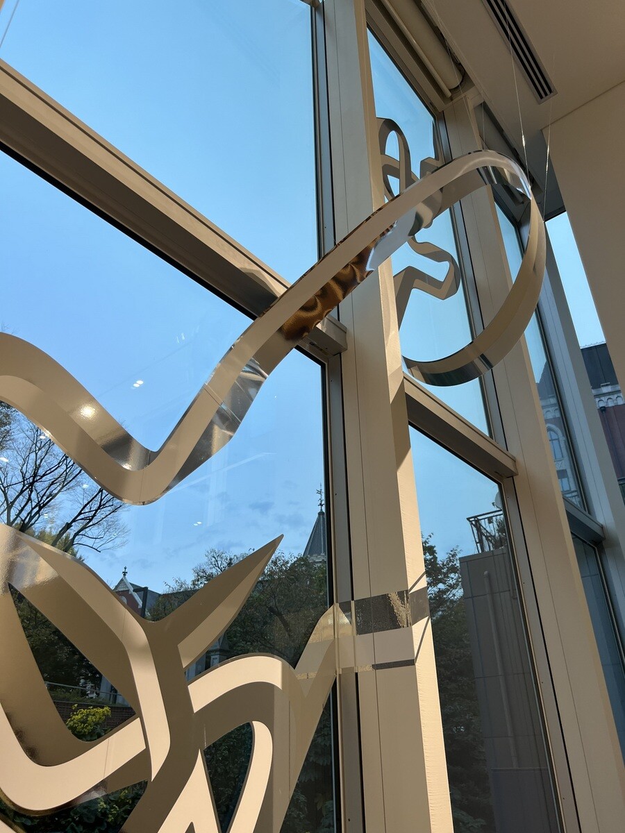 大山エンリコイサム氏と言えば、このQTS(クイックターンストラクチャー)かと思うのだが、この作品はインクジェット印刷した粘着性ビニールが立体的に盛り上がっている。窓の裏側からも同様に模様が見えるようになっているとのこと。因みに、作品名となっている「FFIGURATI」はイタリア語(大山エンリコイサム氏のご両親はイタリア人と日本人)の驚きを示す「FIGURATI」に、グラフィティー「GRAFFITI」のスペルを合わせて作った造語。白とシルバーの組み合わせは今回が初めてらしい。