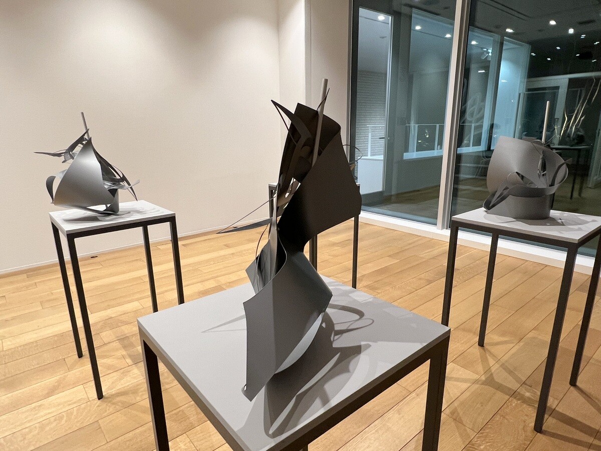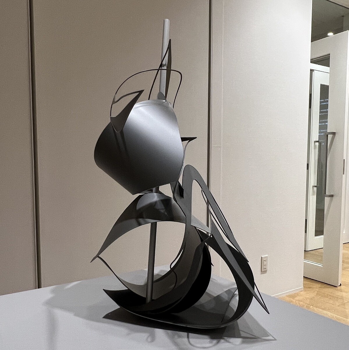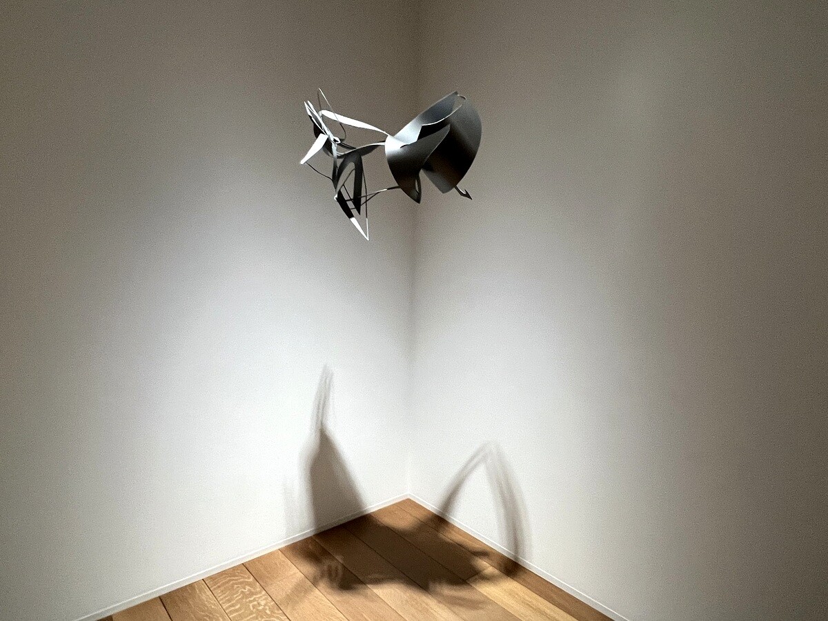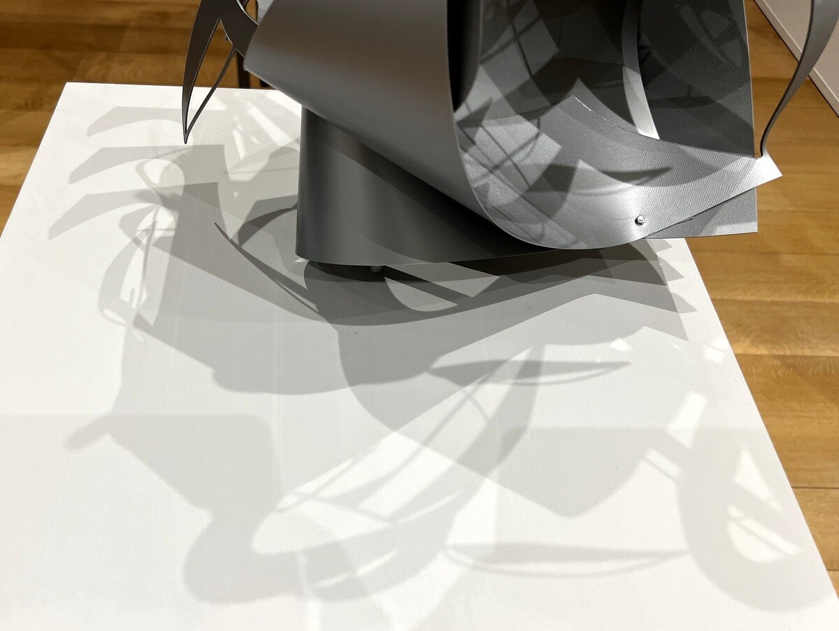 「FFIGURATI #444」 エレベーター横にある立体物は天上からテグスで吊られていて、わずかな風でもゆらゆら回転する。映り込む影も異なる。展覧会設営開始後に思いつかれて披露された作品。