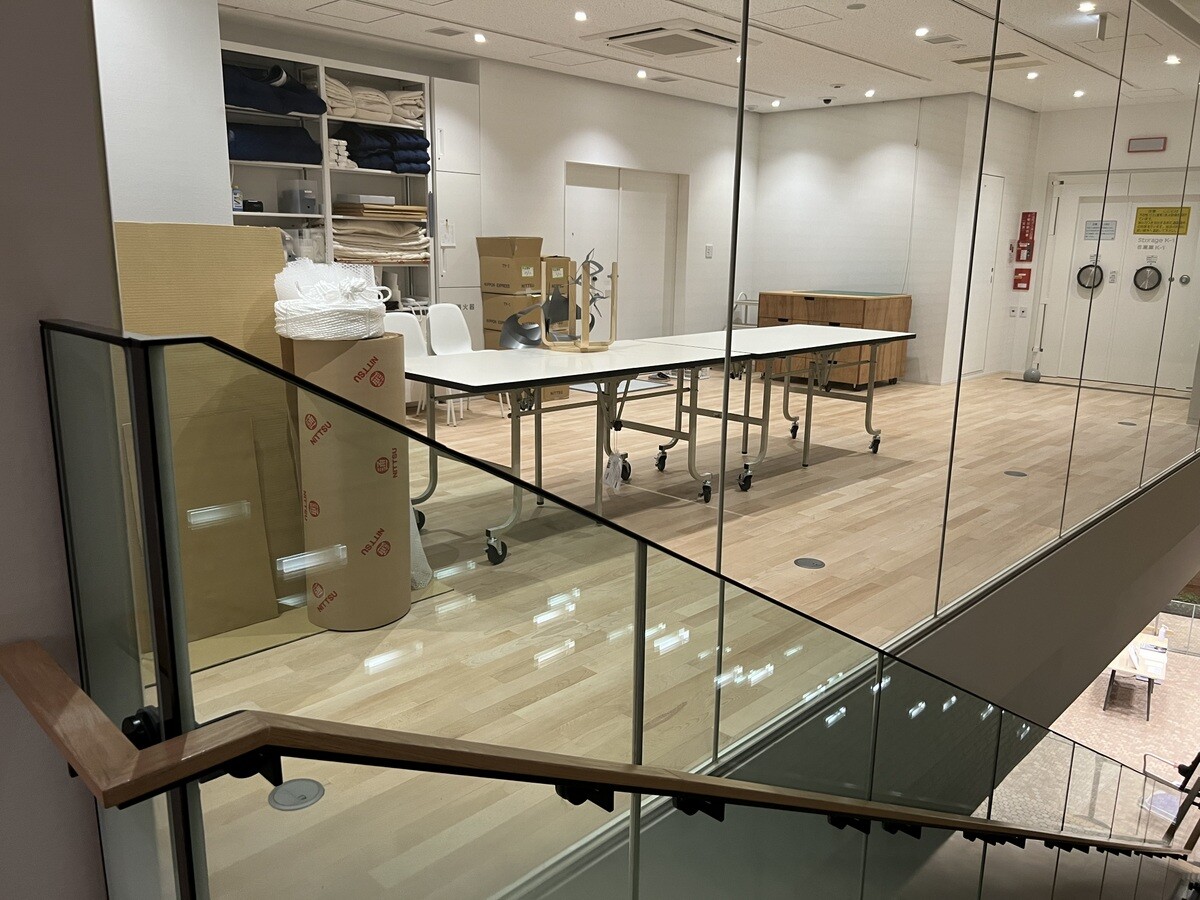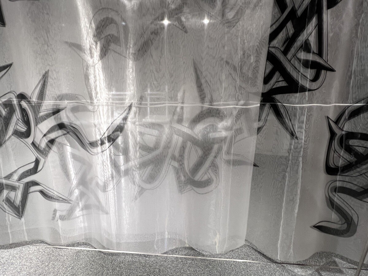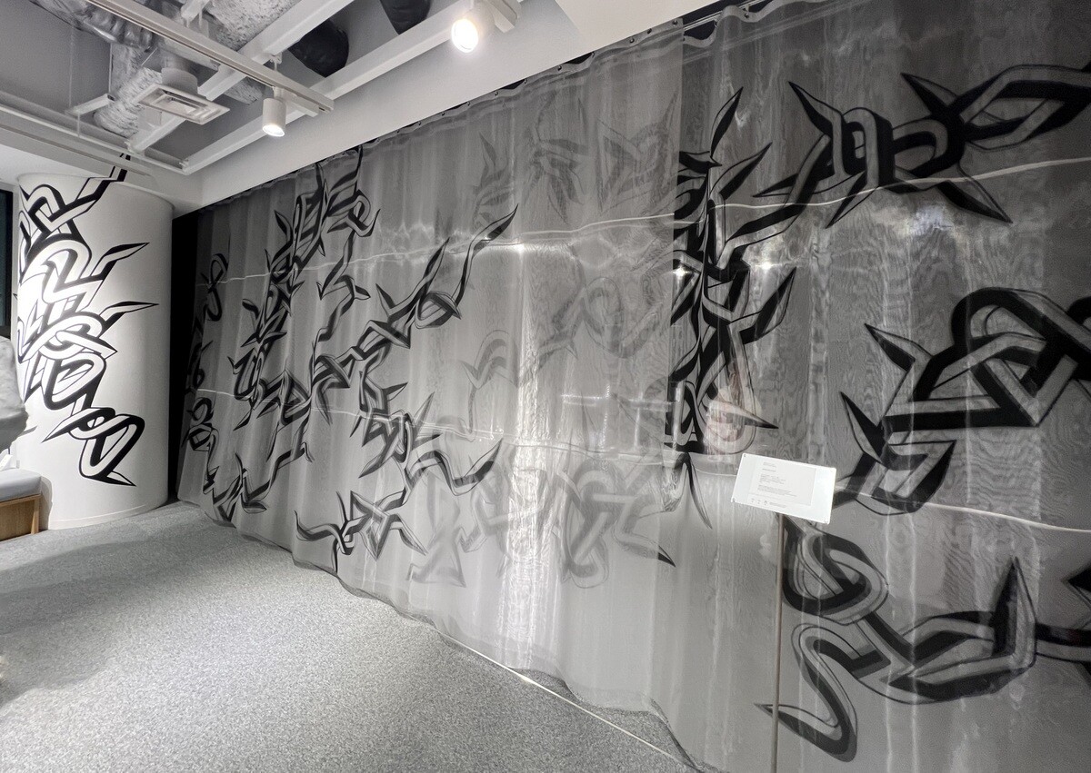 可変スタジオになっていて、このカーテンの奥は暗幕を敷いて撮影も可能なスペースとのこと。ポリエステルオーガンジーに転写されているのだが、重なる部分では4重になり、風でゆらいで面白い。柱にも描かれている。