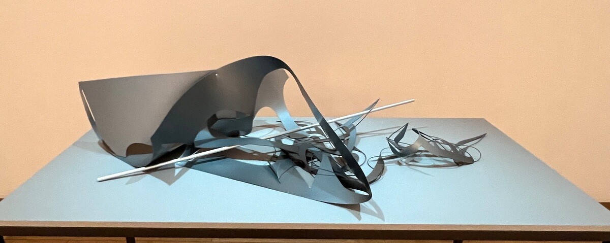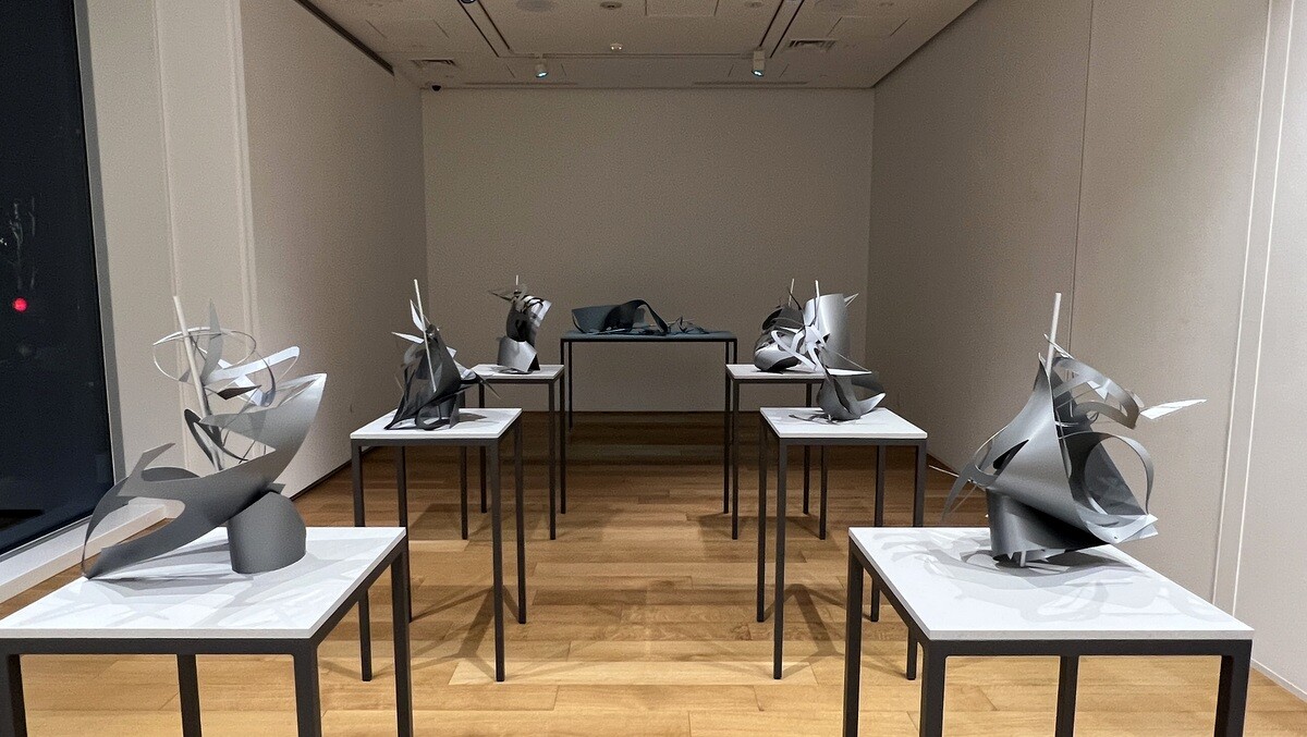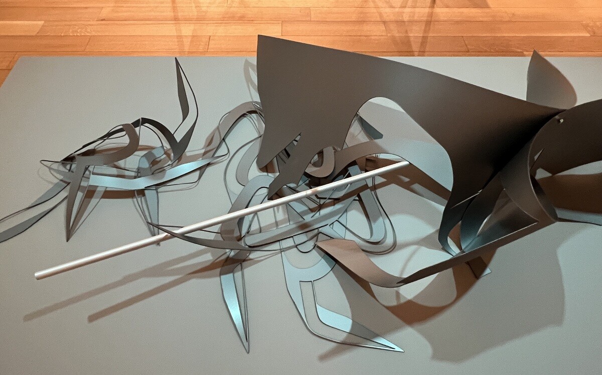 90センチ×70センチのポリプロピレンシートから、QTSをレーザーカッターで切り出し、残った部分も全て合わせて作品としており、いずれも同じストラクチャーを切り出しているのだが、アルミパイプと一カ所だけのネジを利用して、色々に捻るなどすることで個々に形が異なる作品群で、見る角度によっても全く異なり、それぞれが作る影も面白い。