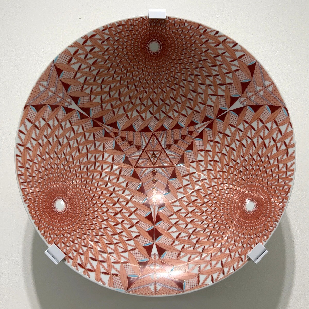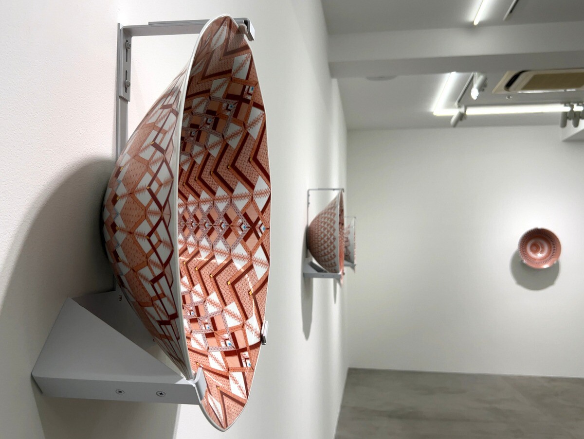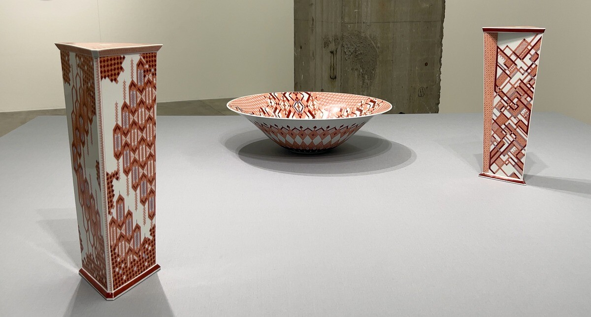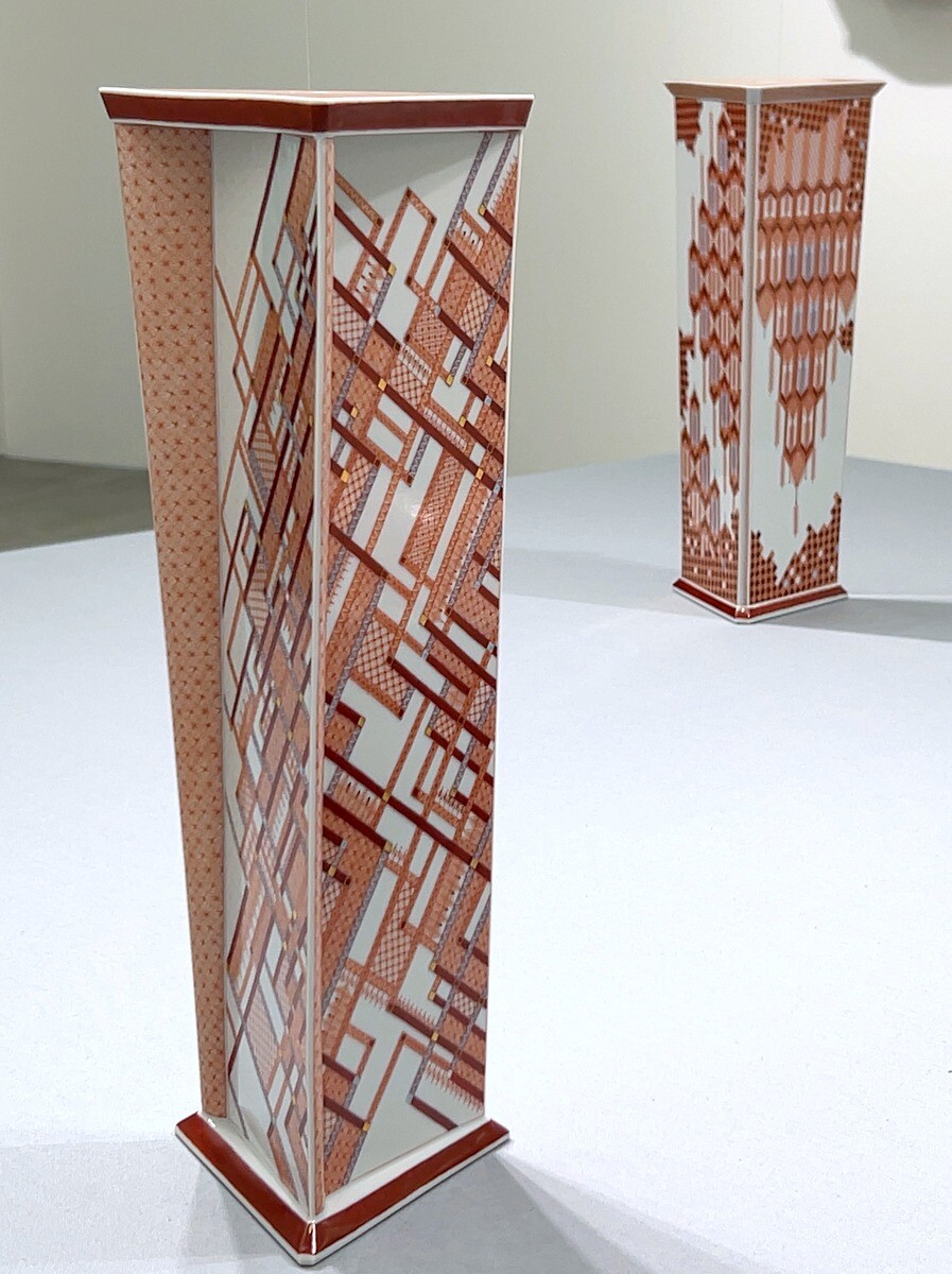 九谷焼の伝統的な赤絵細描の作品は、瓔珞文や麻の葉文といった伝統的文様を基礎とした幾何学的な文様や連続したパターンが特徴。1ミリ幅のなかに複数の線を描く卓越した技術は圧巻。下絵を一切描かず、全て手描きによるのだそう。