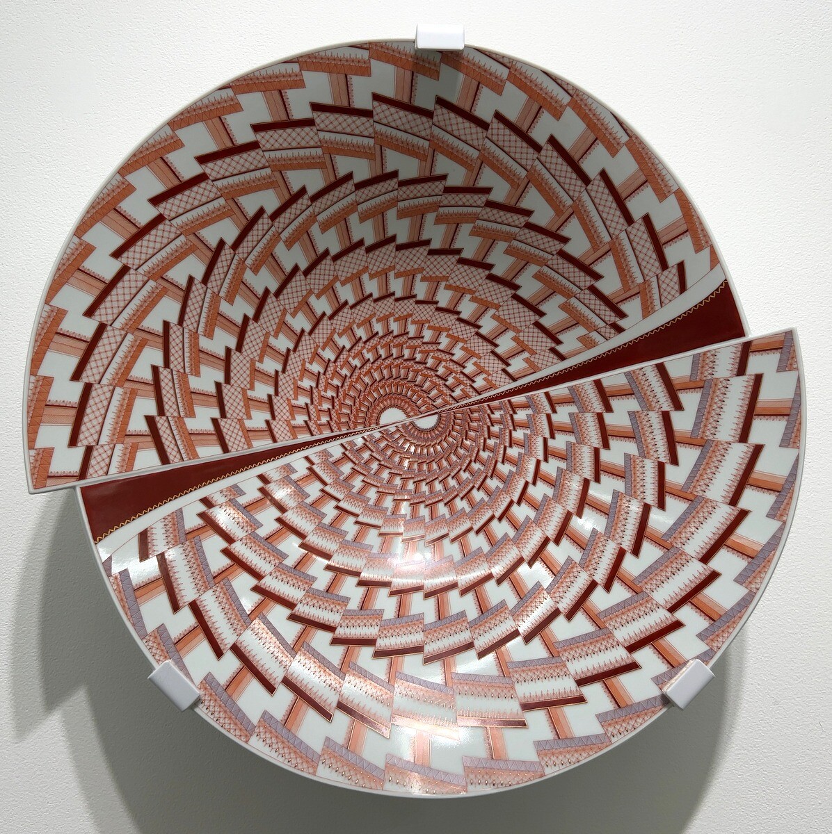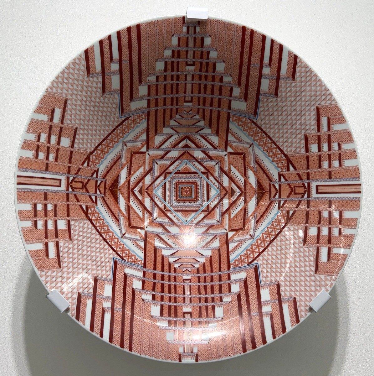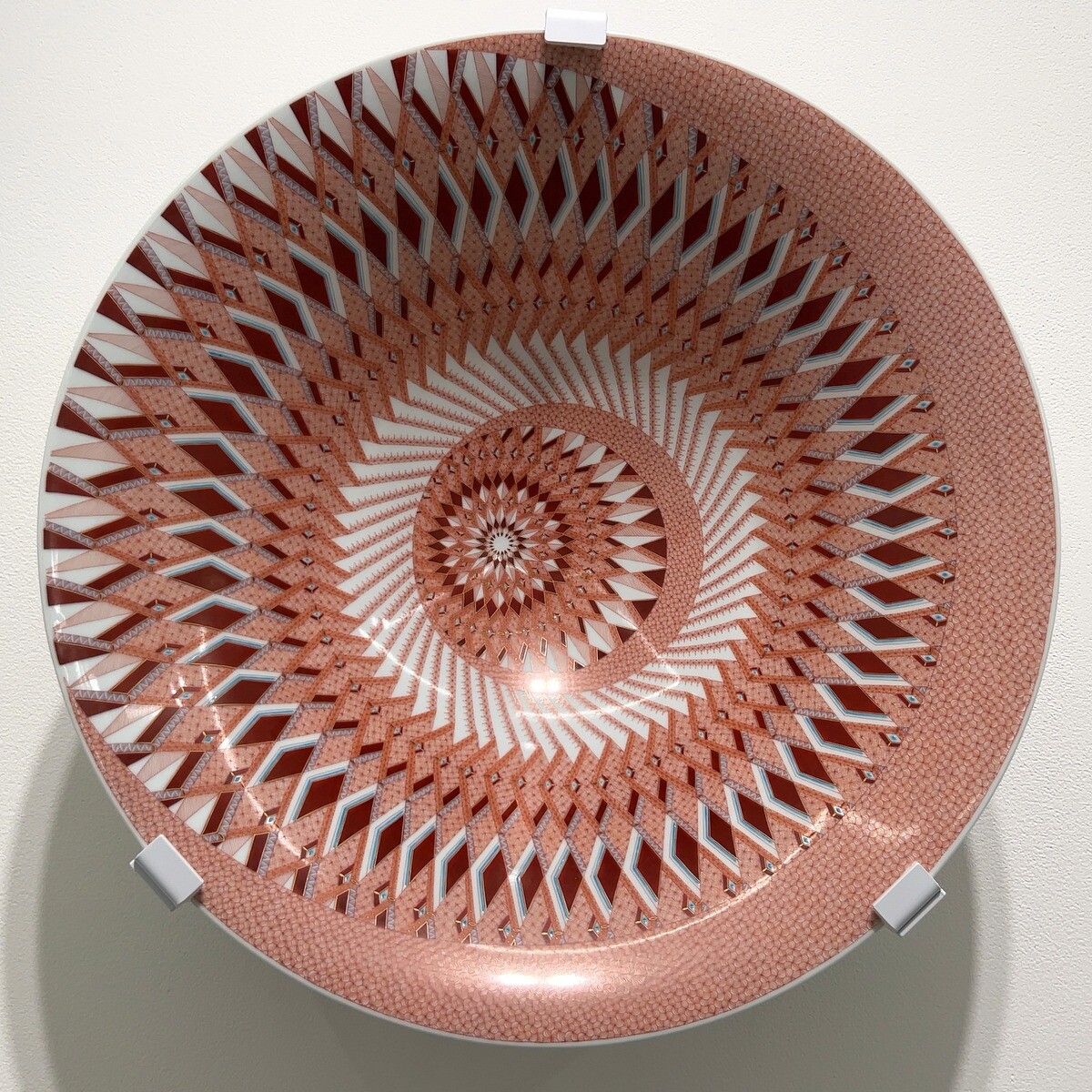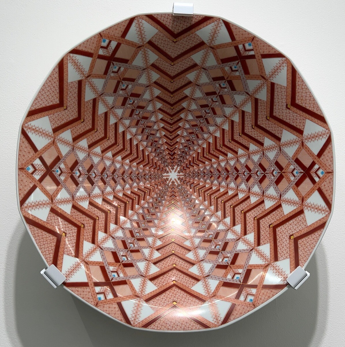 九谷焼の伝統的な赤絵細描の作品は、瓔珞文や麻の葉文といった伝統的文様を基礎とした幾何学的な文様や連続したパターンが特徴。1ミリ幅のなかに複数の線を描く卓越した技術は圧巻。下絵を一切描かず、全て手描きによるのだそう。