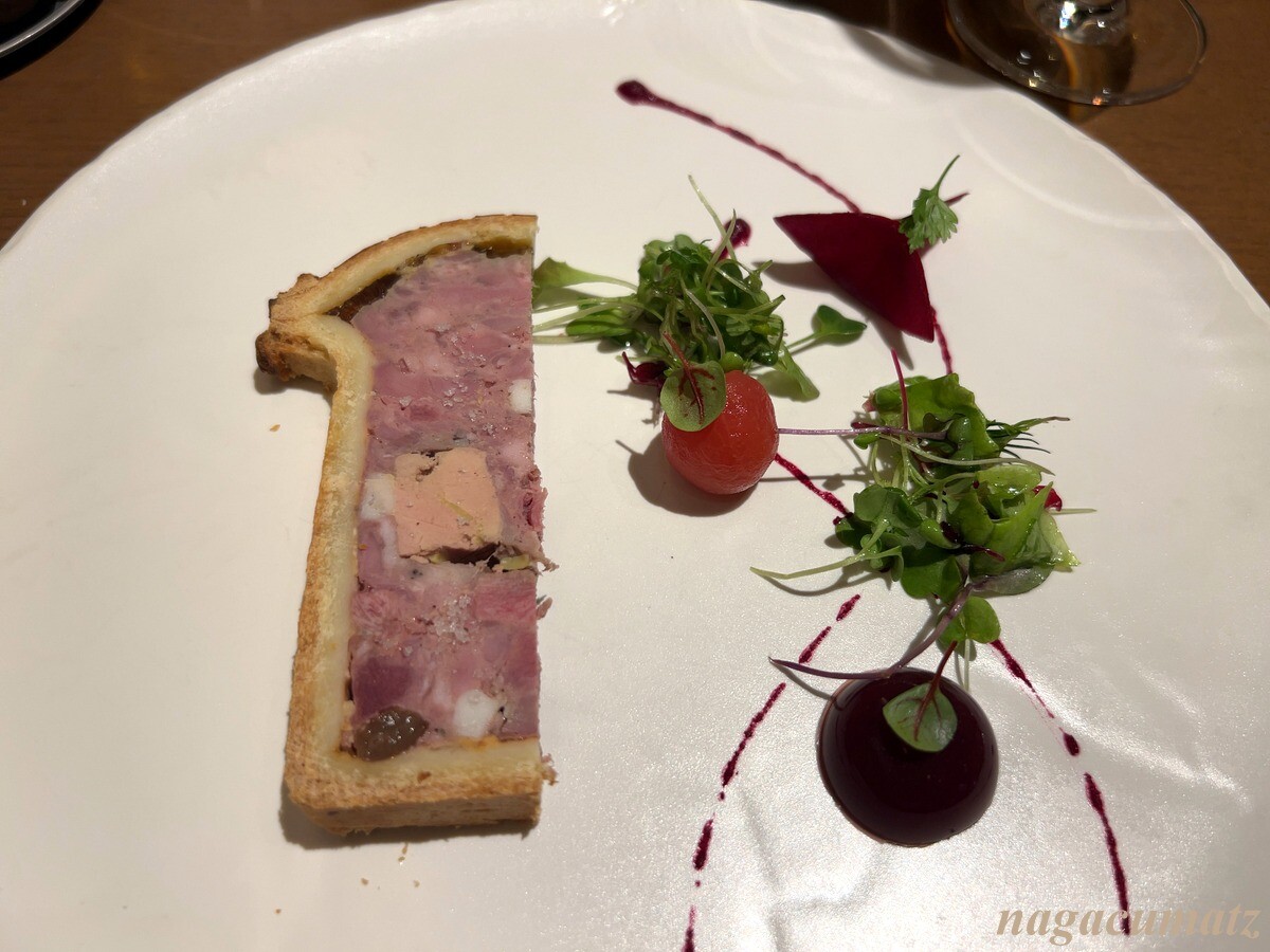 パテアンクルート。フォアグラや鴨肉などの他、白ブドウのレーズンが入っているのだが、他店ではあまり見ないものかなと。ワインのジュレ、中にダイスに切ったリンゴが入ったビーツ、プチトマトなどが付く。