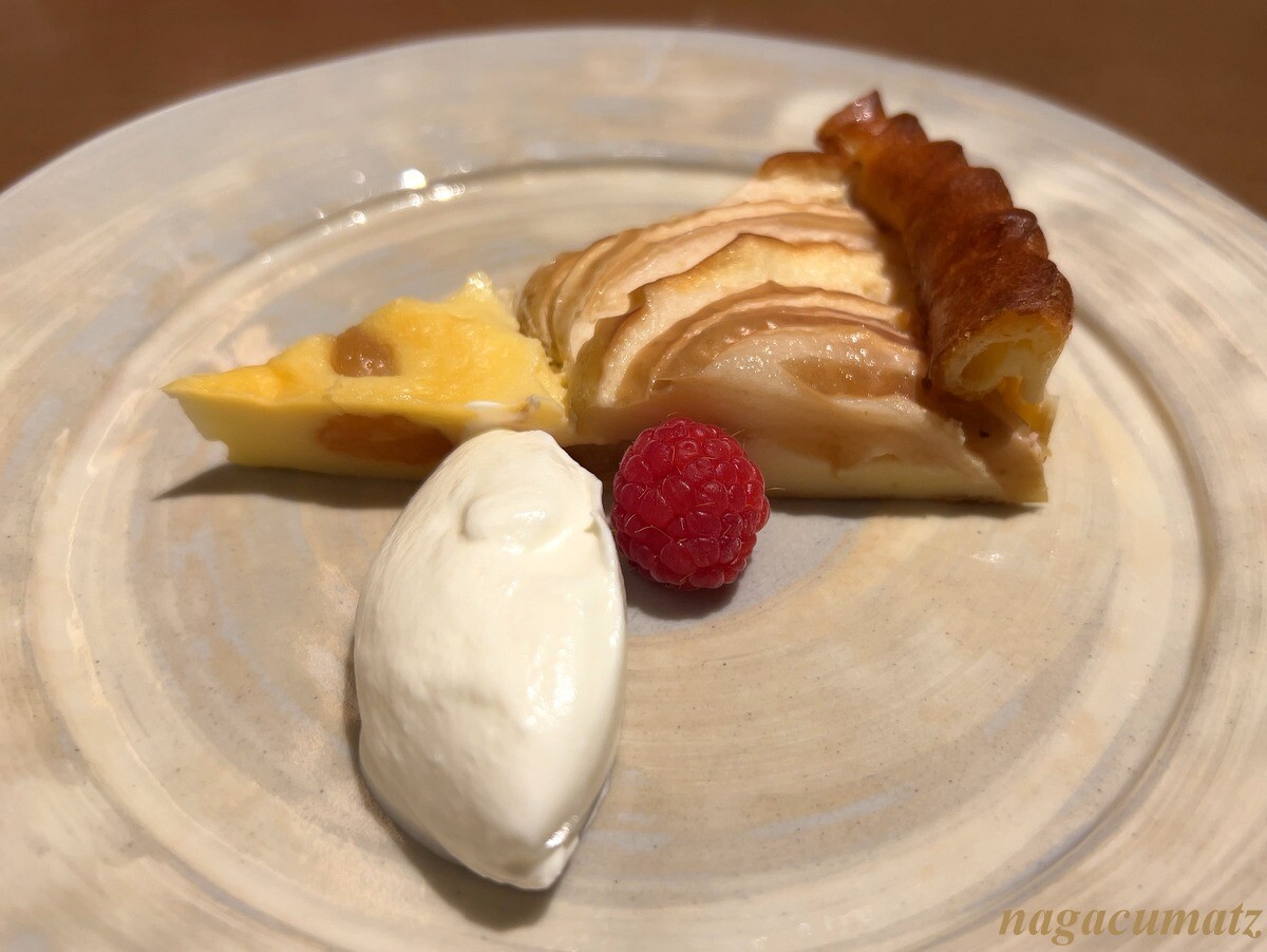 デザートは、リンゴのクラフティ。手前には生クリーム。