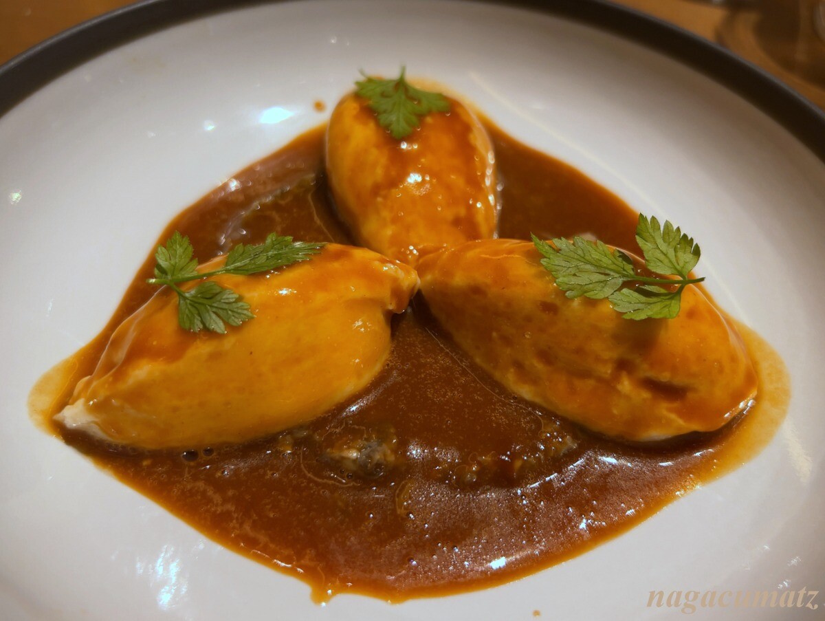 帆立のクネル。下には刻んだマッシュルーム、オマール海老のソース。これも美味しい。