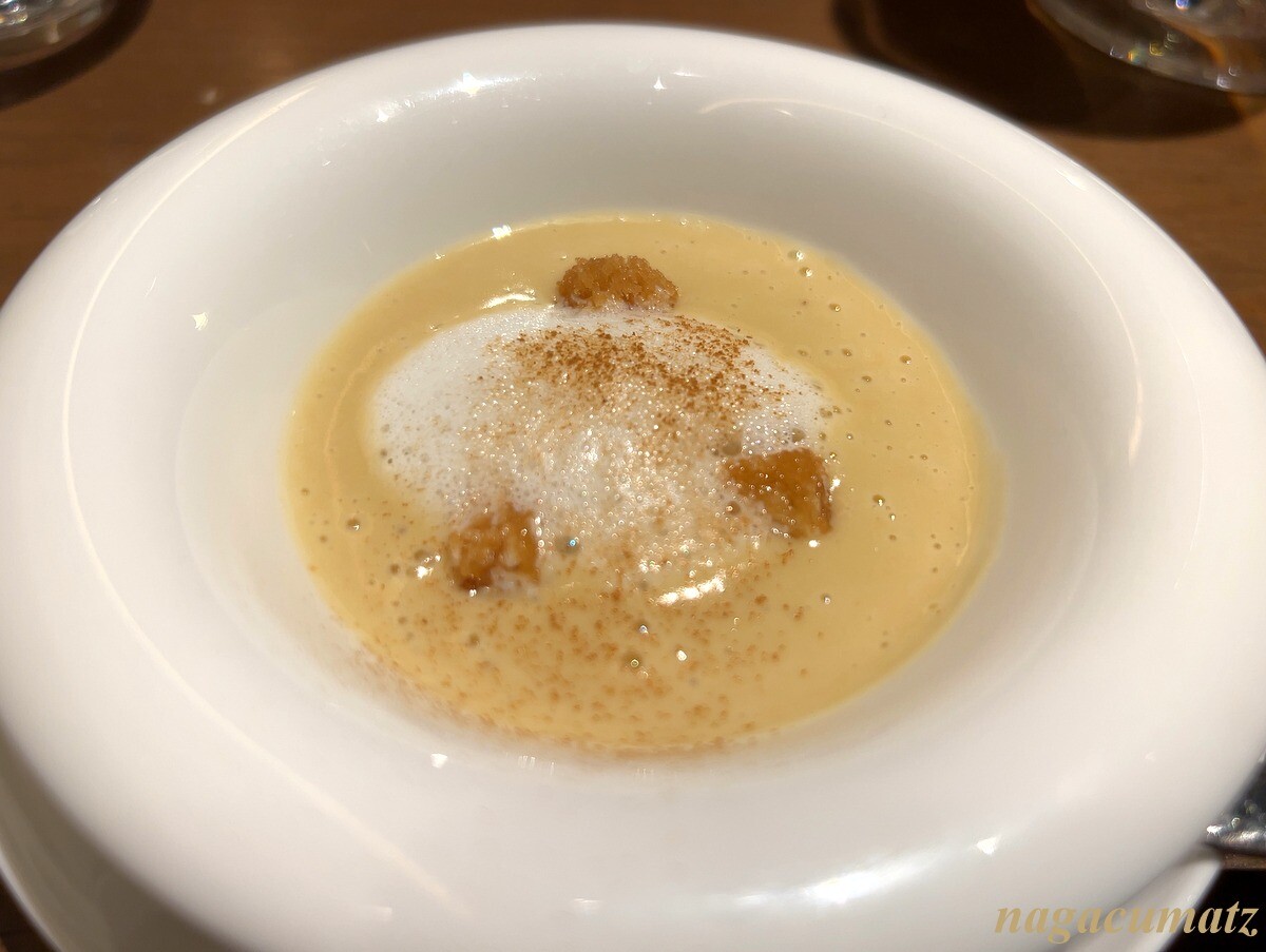 サツマイモのスープには、フォームが載り、シナモンがかかっている。