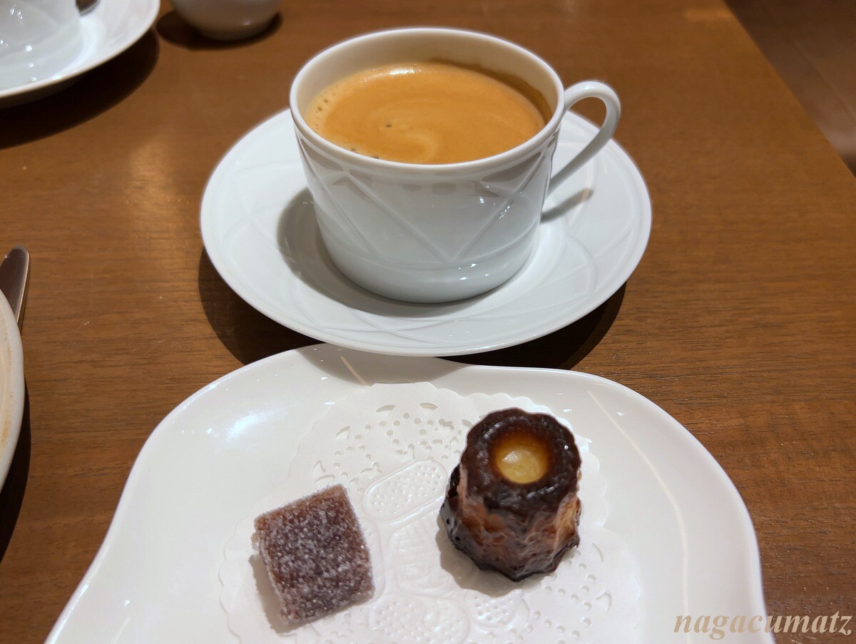 コーヒーとプチフール。カヌレは柔らかめ。パテドフリュイはイチジクだった。