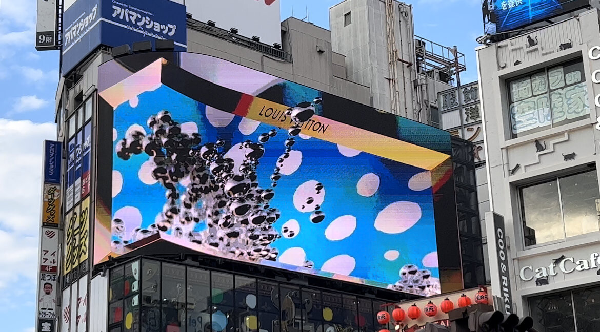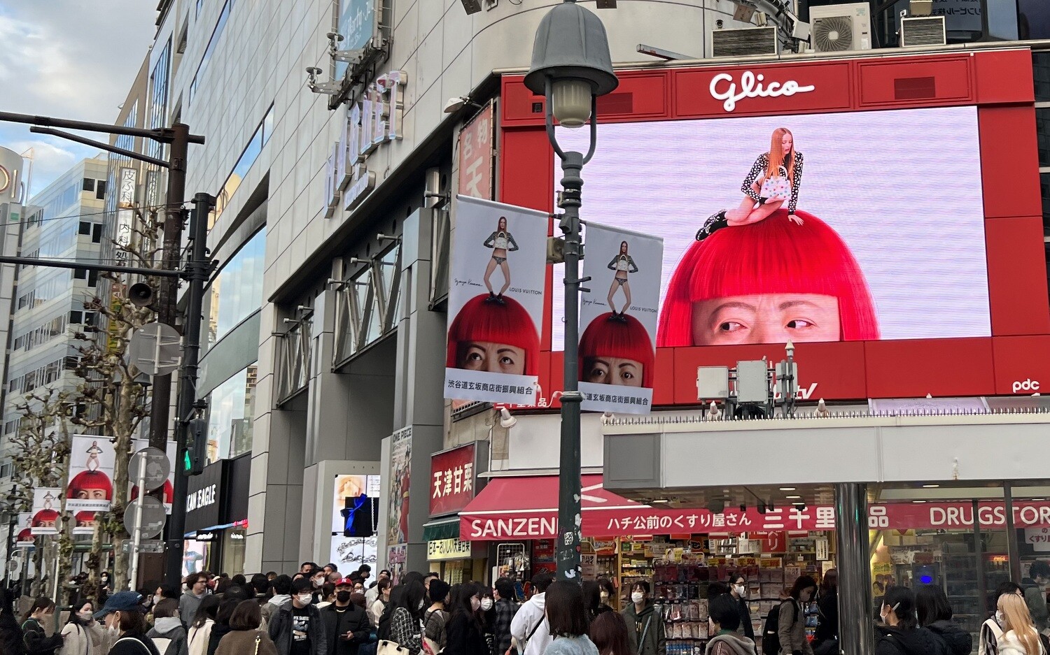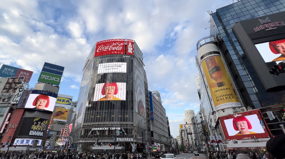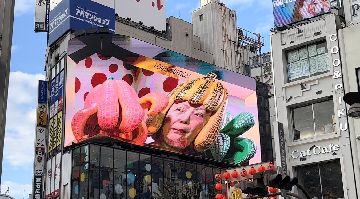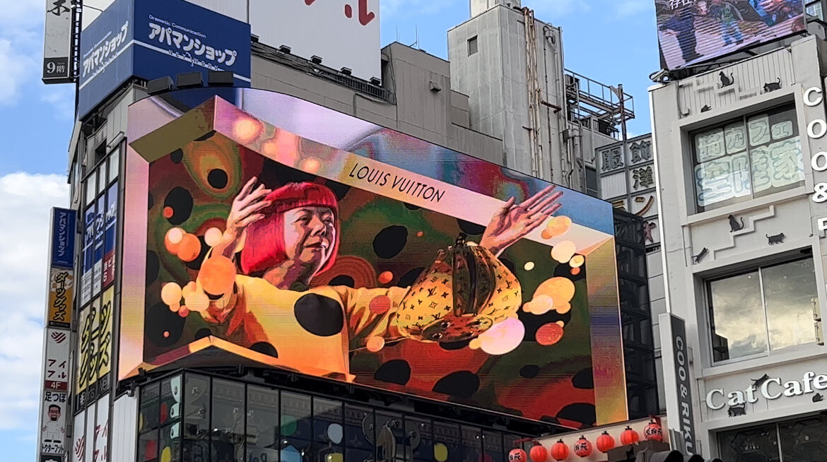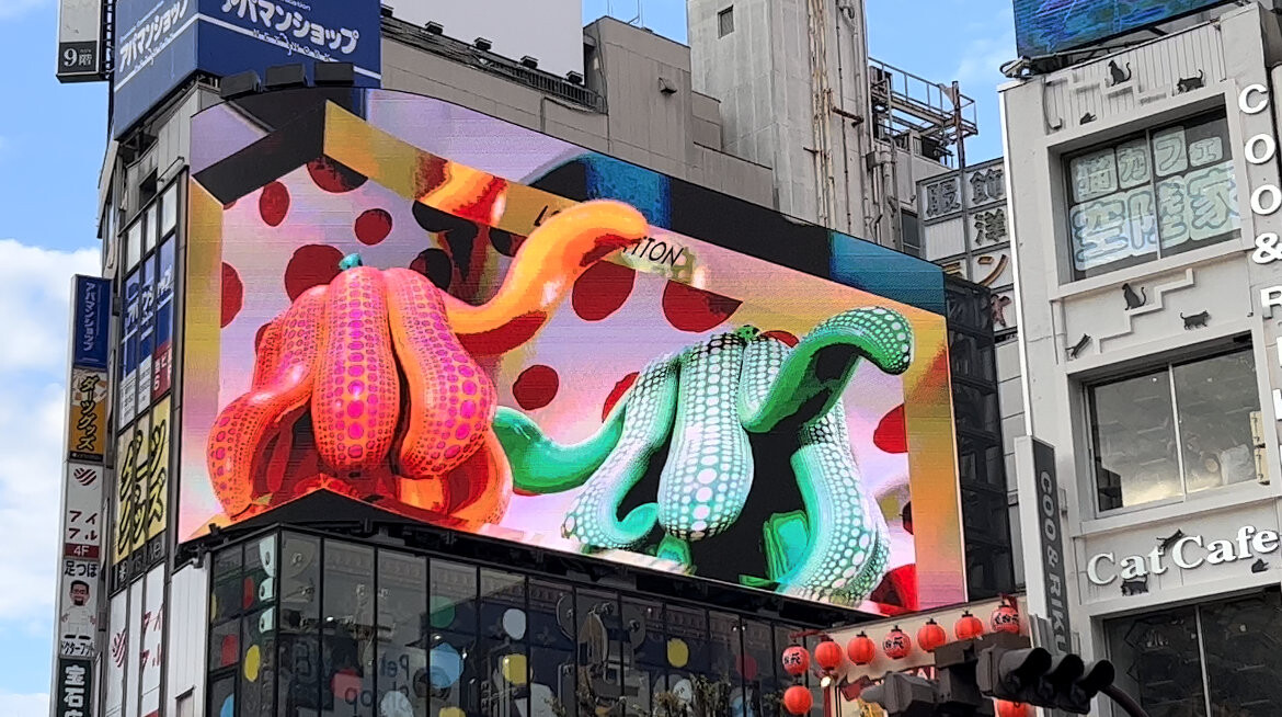 ネコの3D広告ですっかり有名になったこのスポットで、水玉模様をあしらったトランクや草間彌生氏のアバターが飛び出して来た。