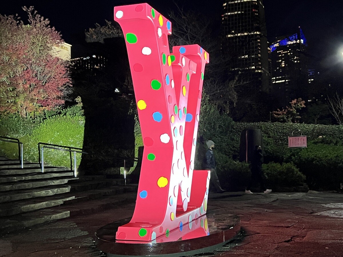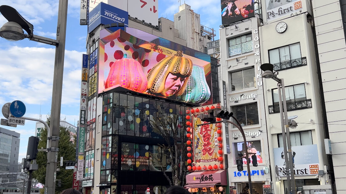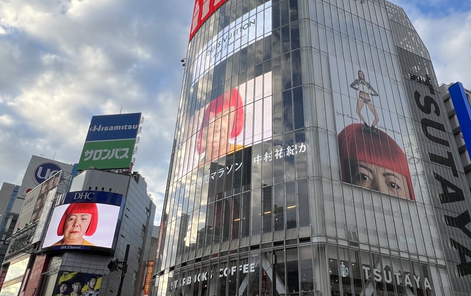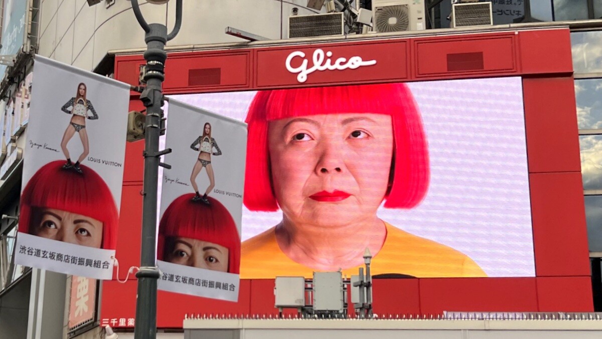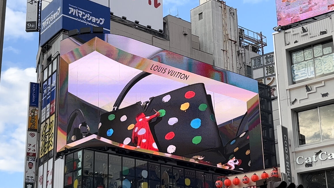ネコの3D広告ですっかり有名になったこのスポットで、水玉模様をあしらったトランクや草間彌生氏のアバターが飛び出して来た。