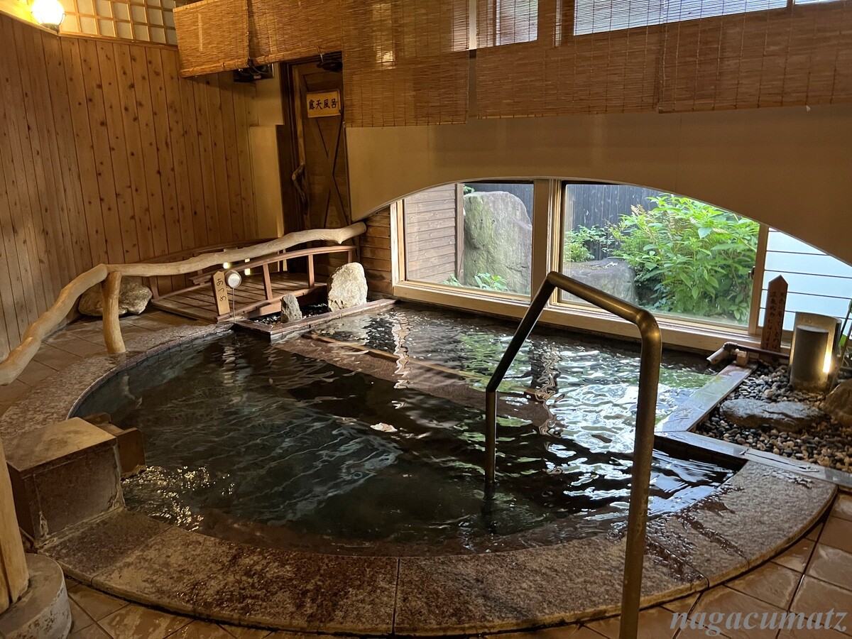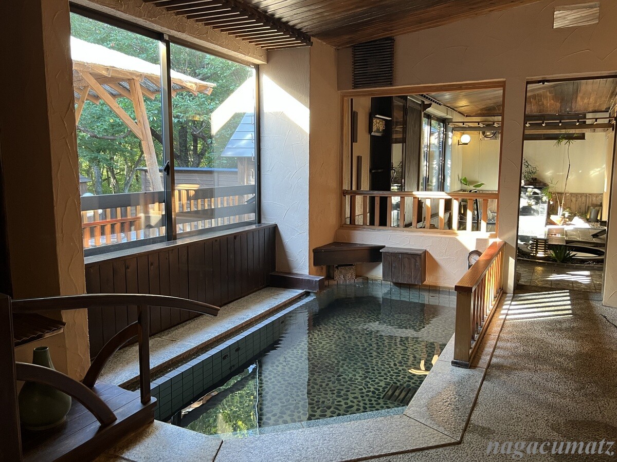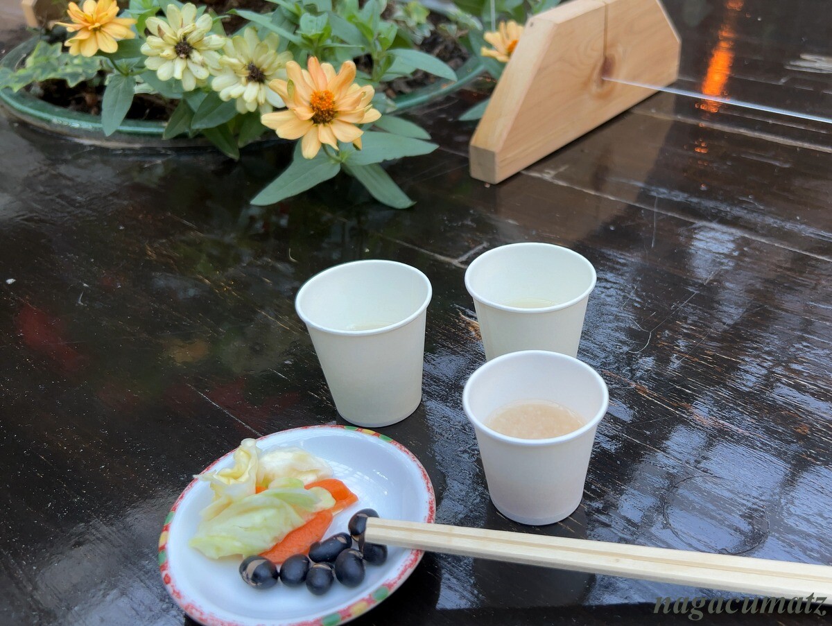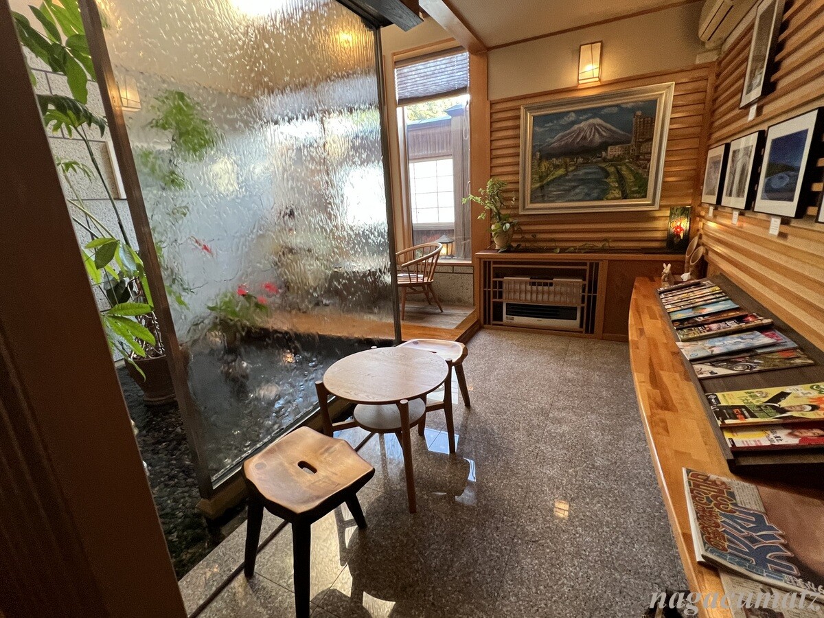 庭が広く、そこを見ながら足湯があったり、日本酒やおつまみが自由に頂けるスペースがある。