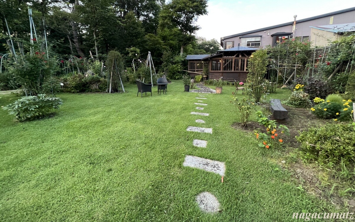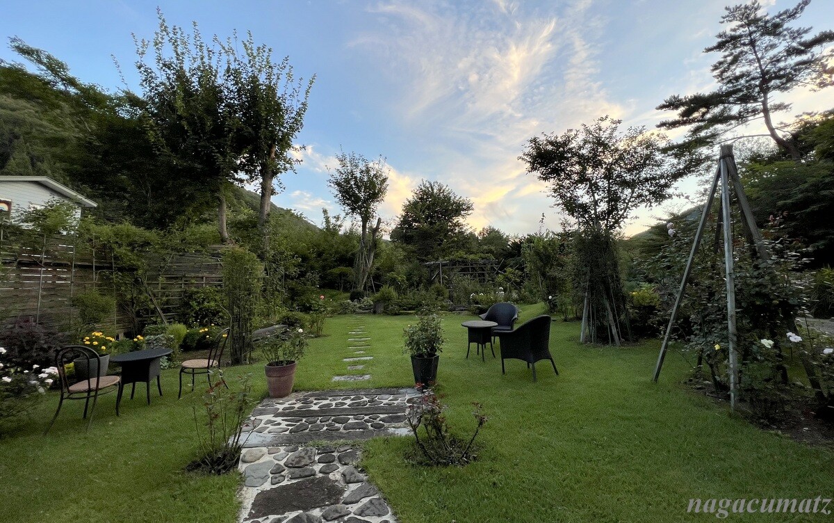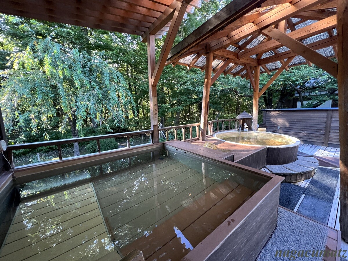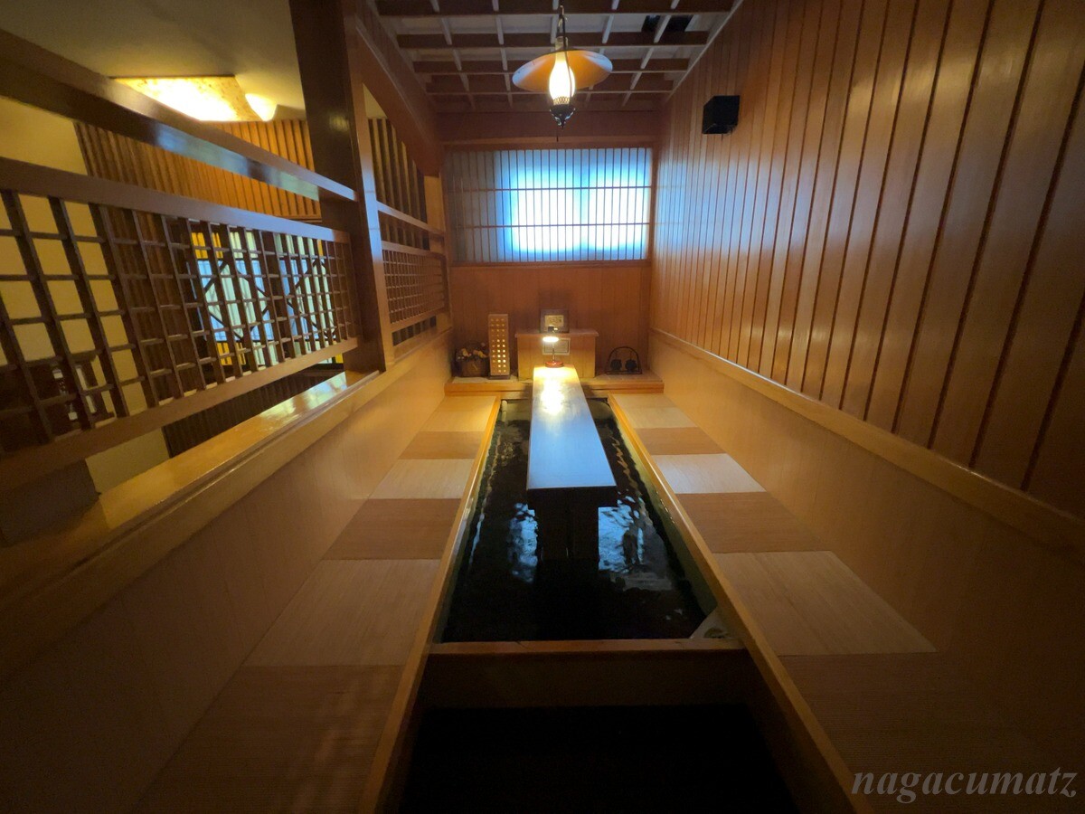 庭が広く、そこを見ながら足湯があったり、日本酒やおつまみが自由に頂けるスペースがある。