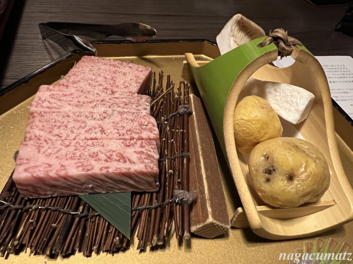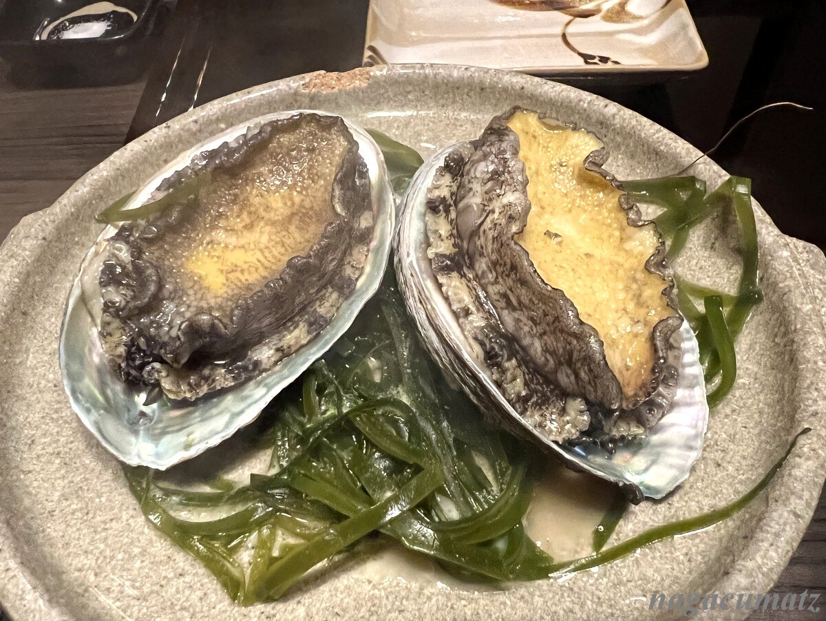 メインは7種類からの選択で、活アワビの陶板焼きと、霜降り前沢牛のサーロインステーキと、杜仲茶ポークの豆乳しゃぶしゃぶを。