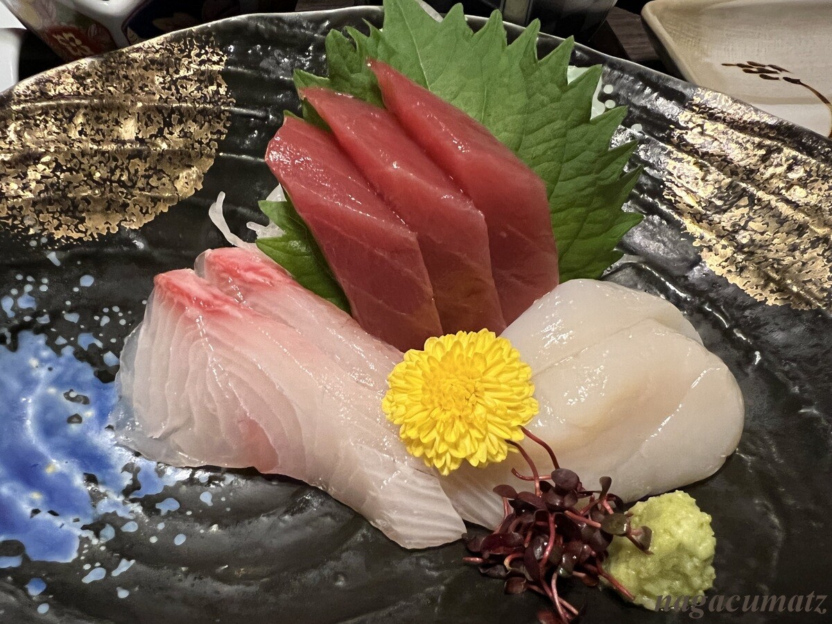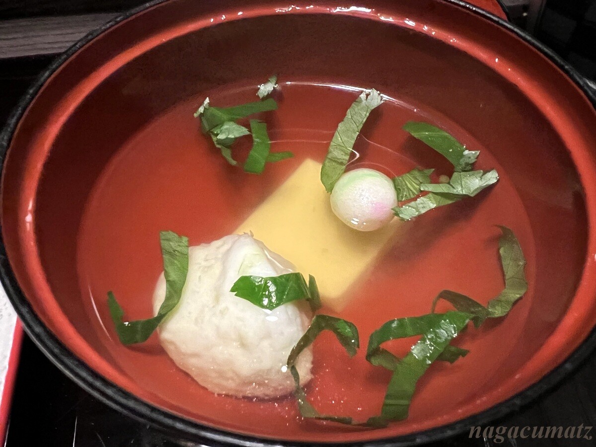 造り 本鮪、かんぱち、帆立吸物 帆立つみれ、とうきび豆腐