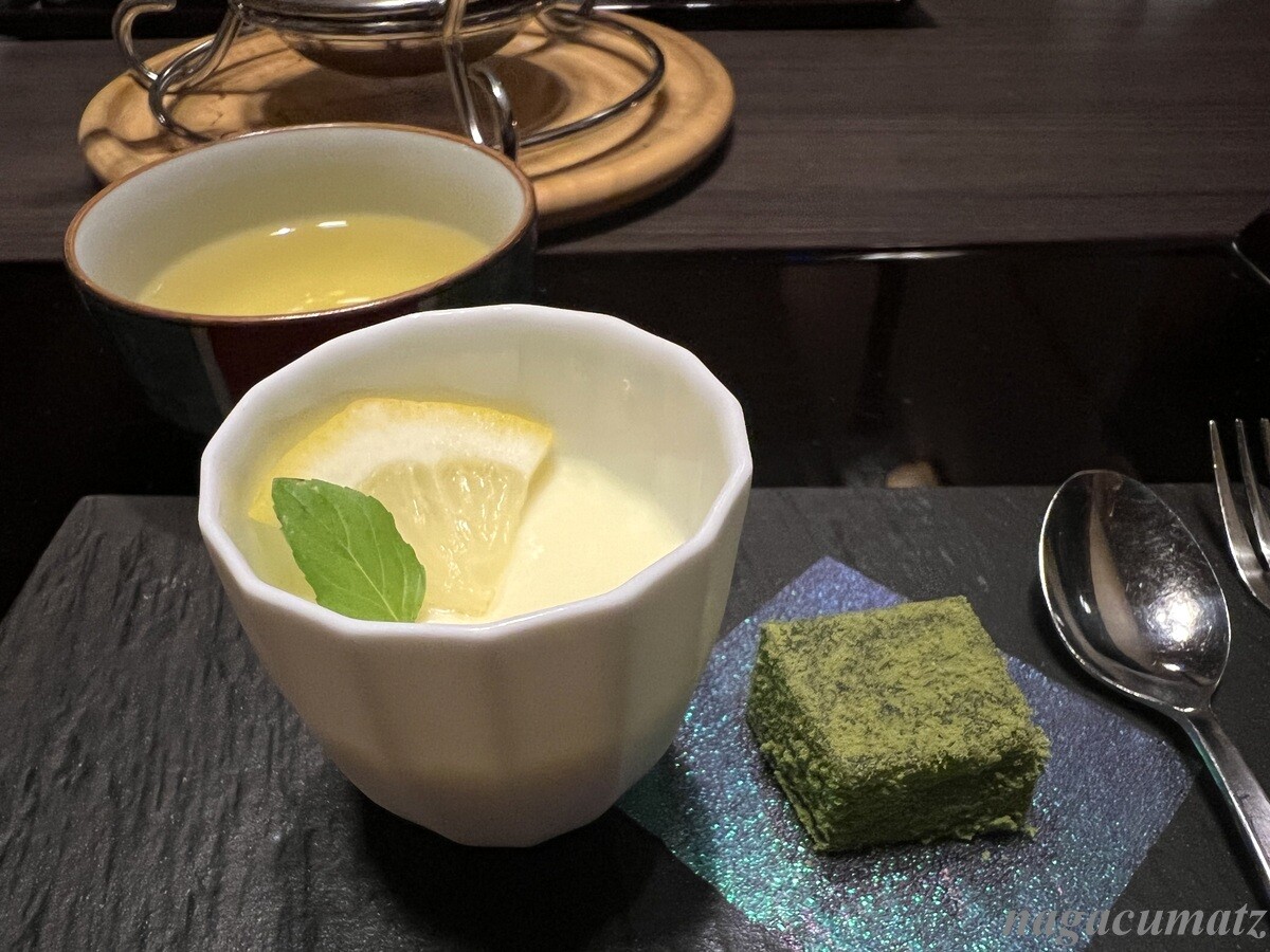 デザートのレモンプリン、抹茶わらび餅
