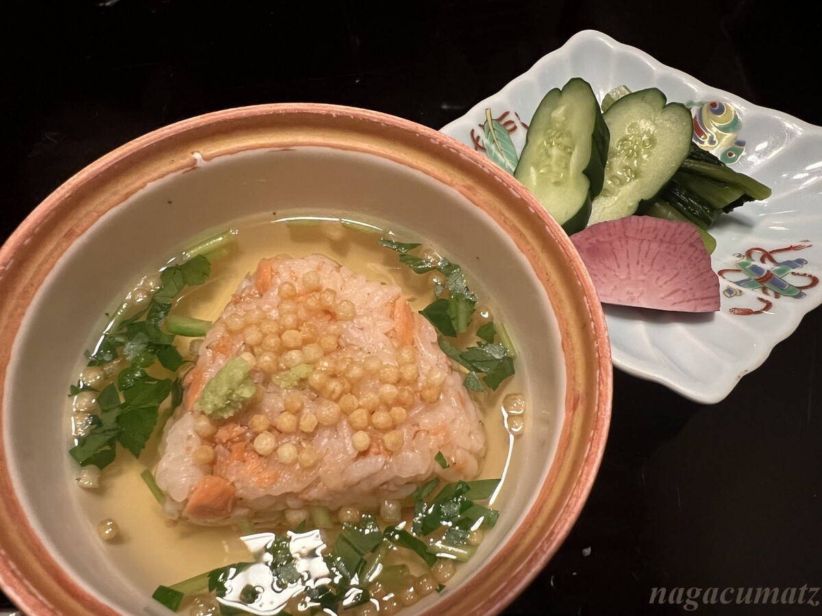 酒おにぎり茶漬け、香物の三点盛