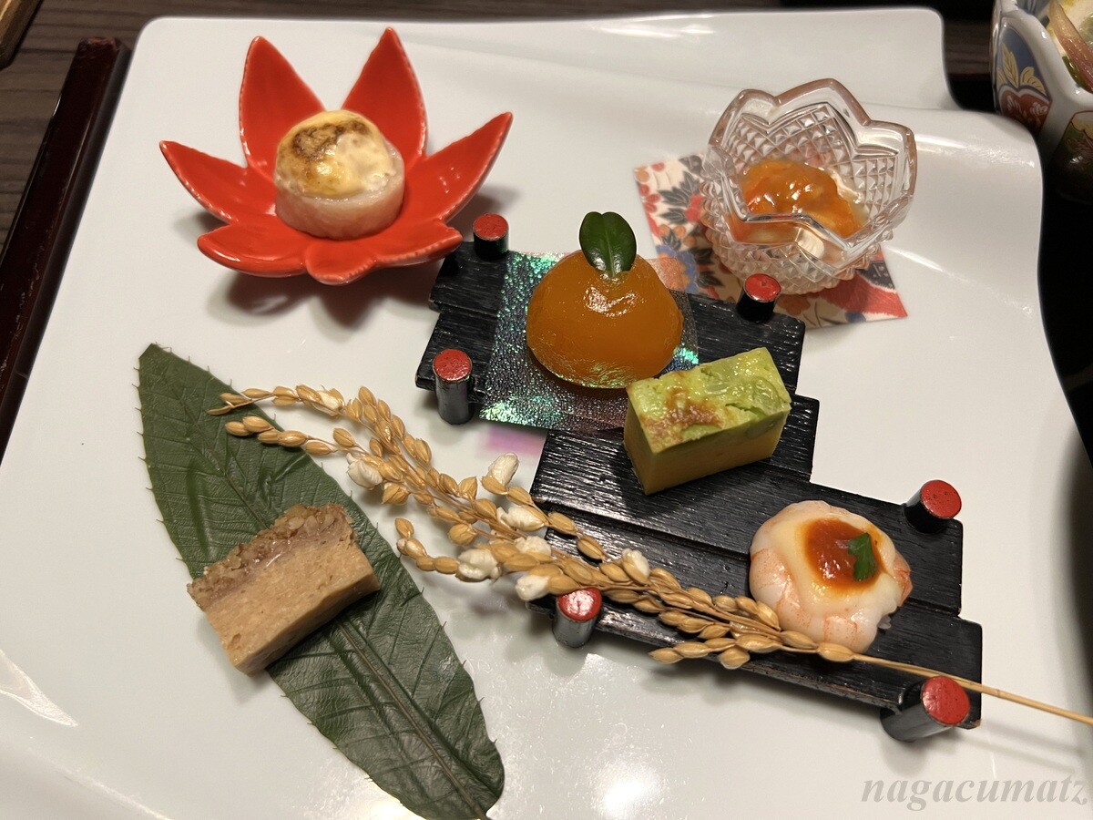 前菜 ホヤ塩辛クリームチーズ、帆立タルタル焼、海老チーズ焼、枝豆福草、べっ甲玉子、胡桃流し