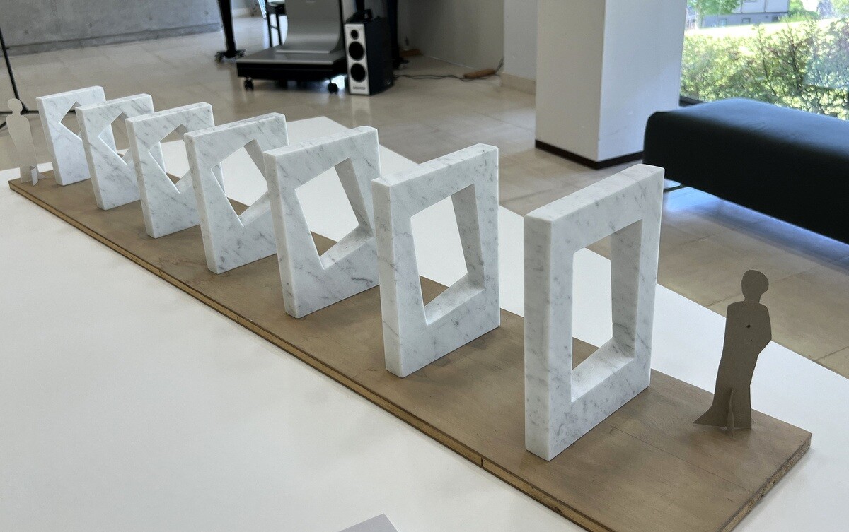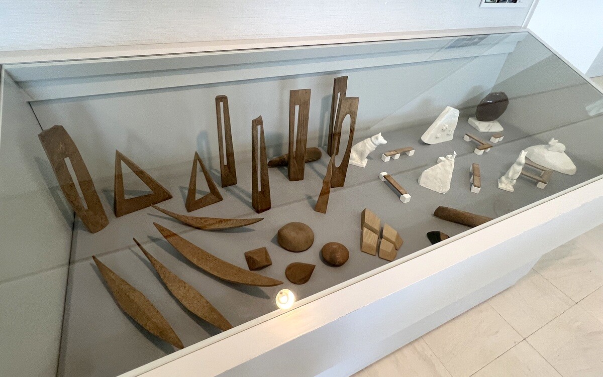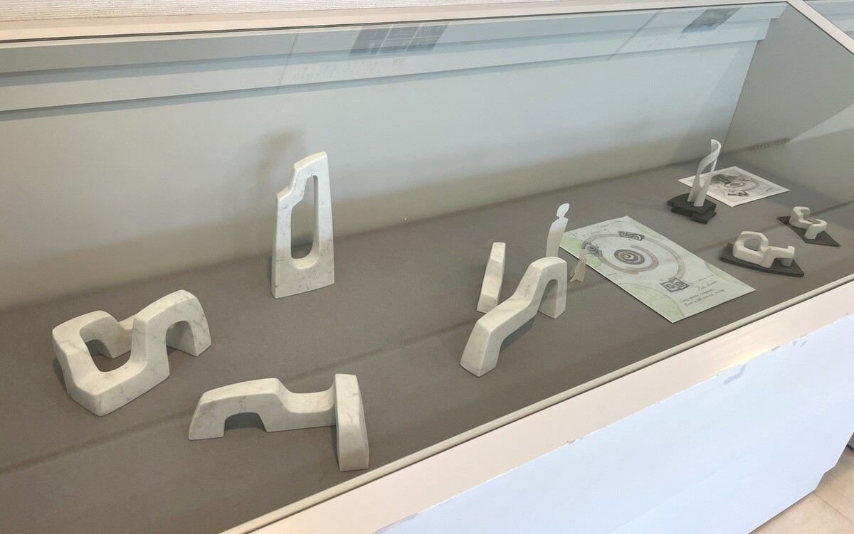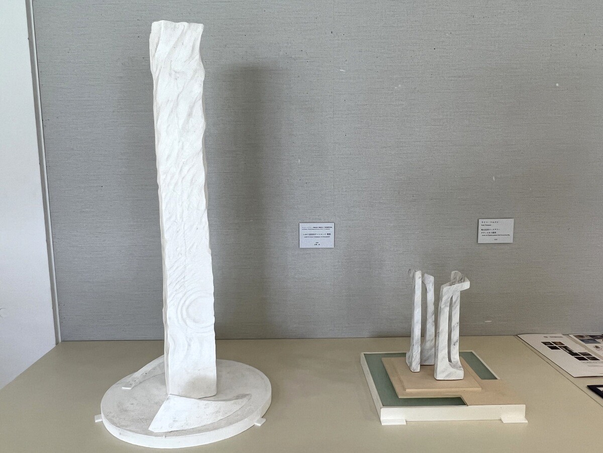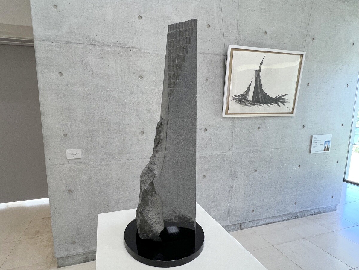 片桐宏典 いわて子どもの森のシンボルモニュメントである「シンフォニア(交響曲)」の模型。2002 後ろにあるのはそのデッサン。