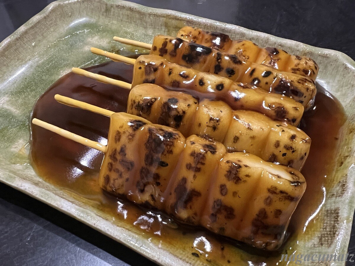 みたらし5本 540円 焼き加減も聞いてくれるので、普通でお願いしたが、香ばしい。タレは北海道厚岸産の昆布のダシ、香川県産のたまり醤油と白ざら糖を使っているとのこと。