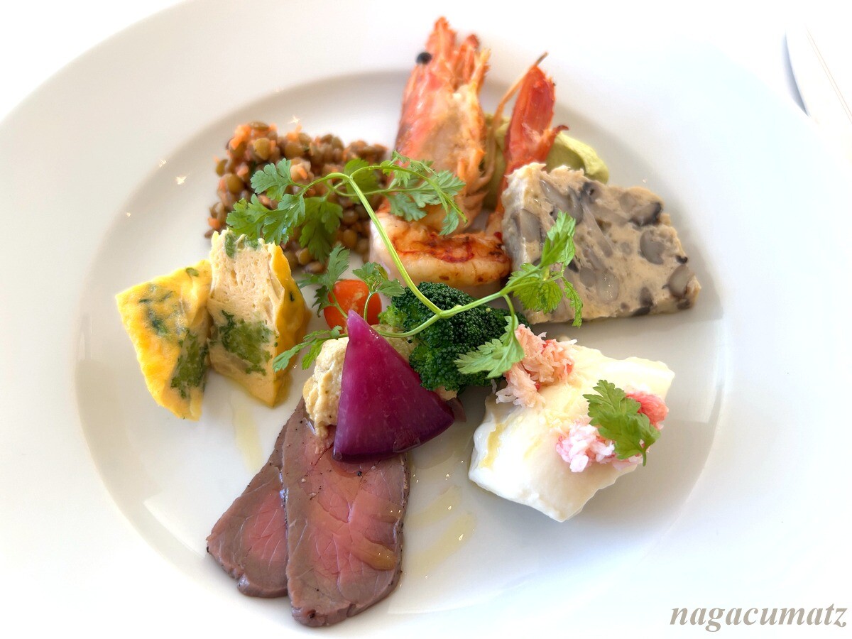 海老から時計回りに、海老の下にはアボカドペースト、茸と鶏肉のテリーヌ、カリフラワーのペーストにズワイガニ、牛肉のたたき、イタリア風オムレツ、レンズ豆、ブロッコリーなど野菜各種。