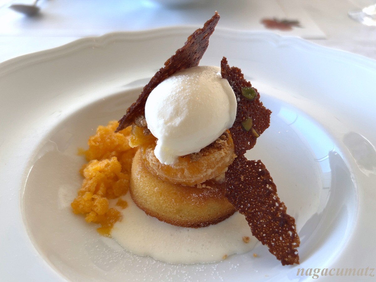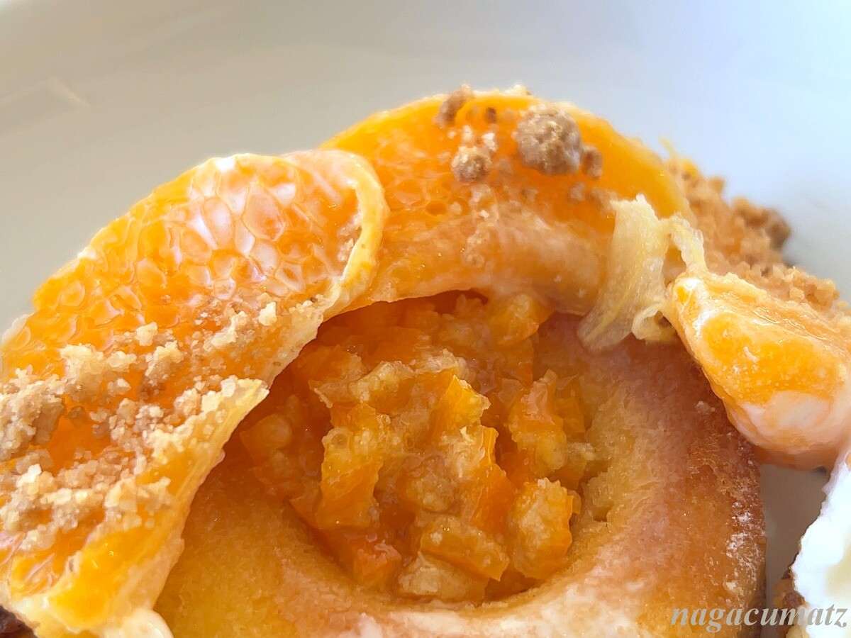 台のケーキはくり抜かれていて、中に刻んだ甘くマリネしたポンカンなどが入っている。