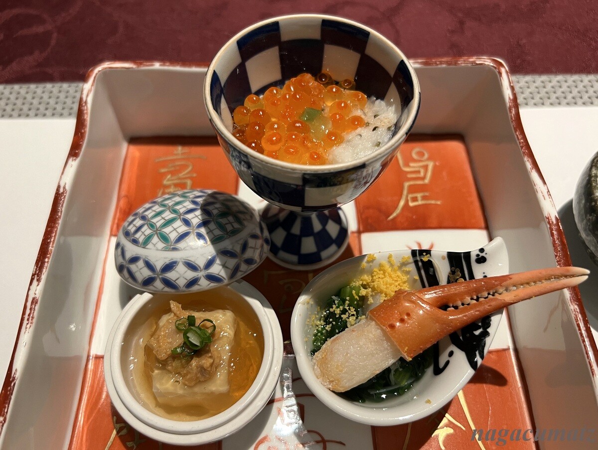 ・白子豆腐 鮟鱇友和え 土佐酢ゼリー 胡麻豆腐に河豚の白子を入れて練り上げてある。鮟鱇の身は鮟肝で和えてある。