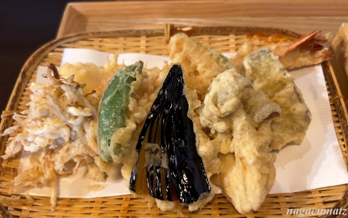天麩羅は、しめじ、茄子、スナップエンドウ、牛蒡のかき揚げ、カボチャ、サツマイモ、海老。ちょっと衣が分厚すぎて、海老本体は大きいのだがアメリカンドッグのよう💦