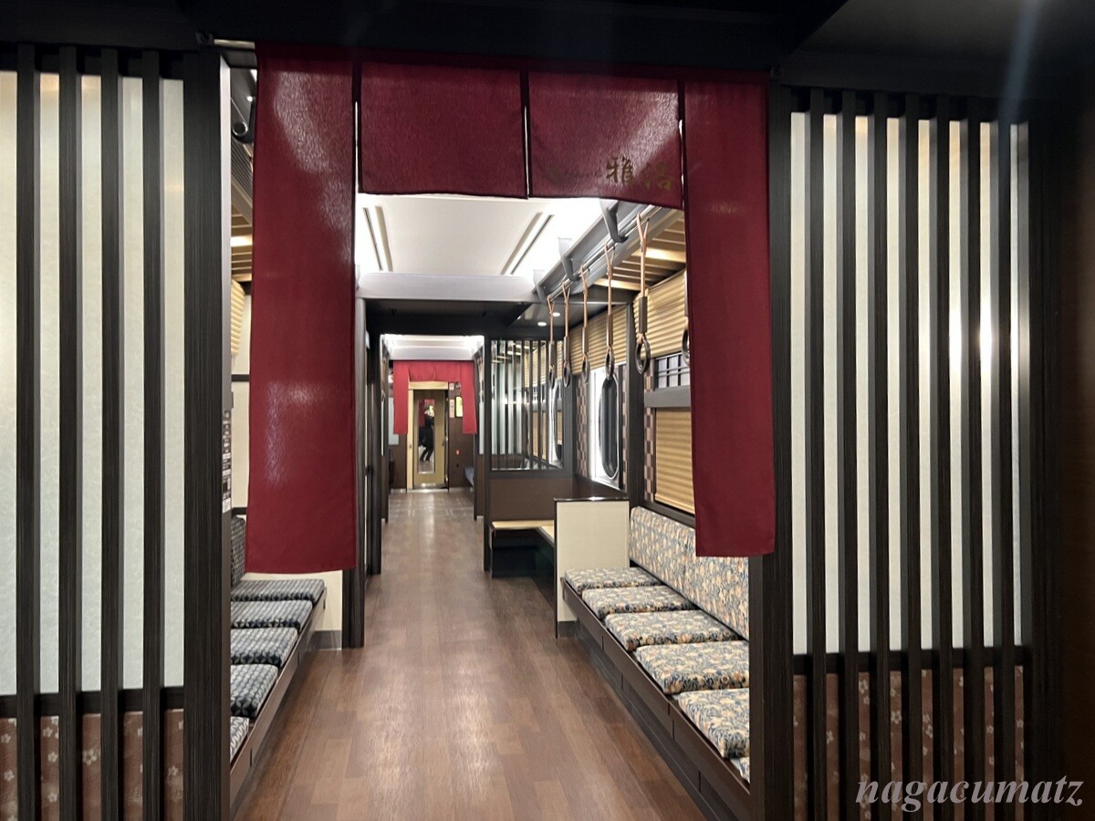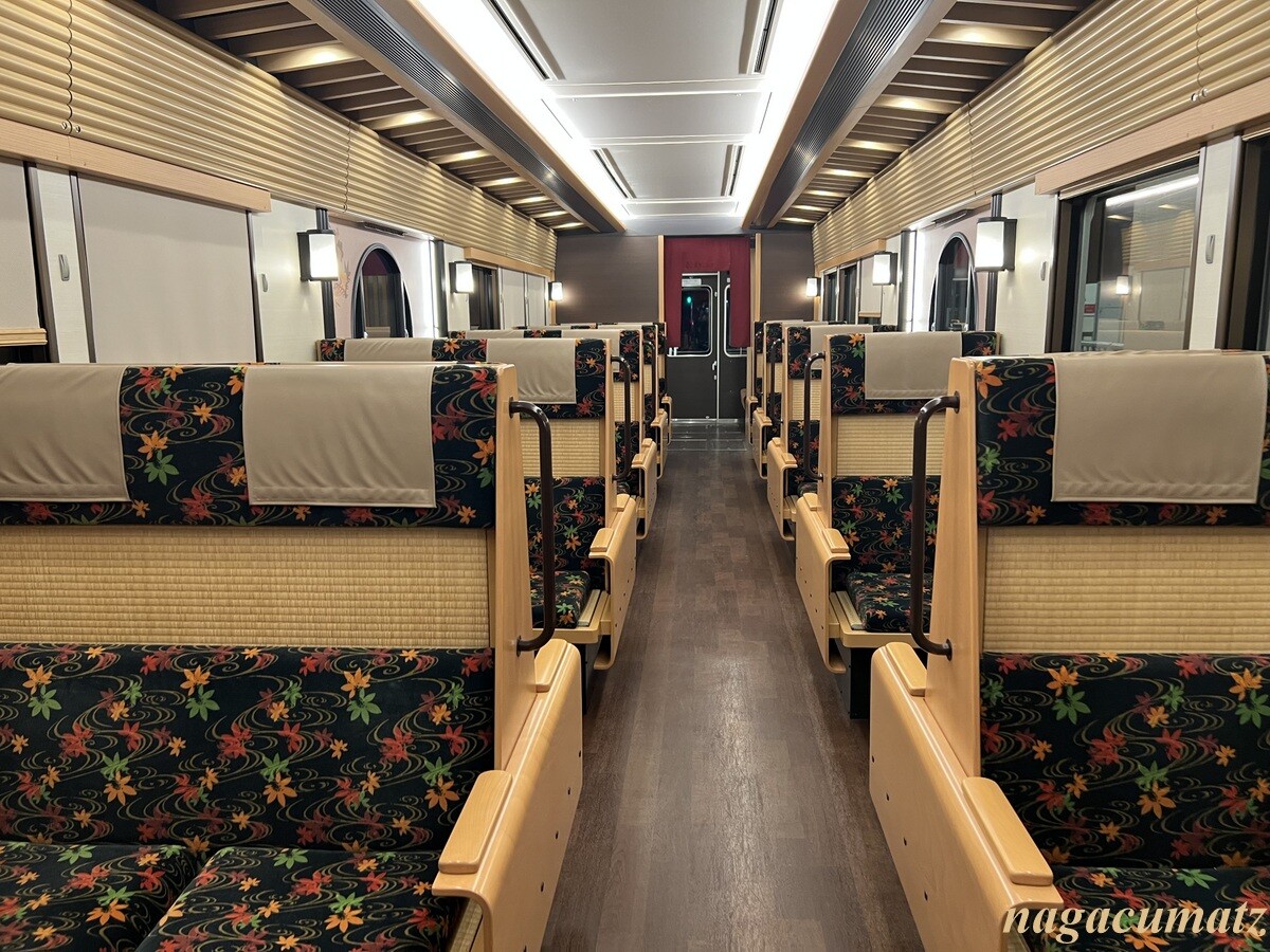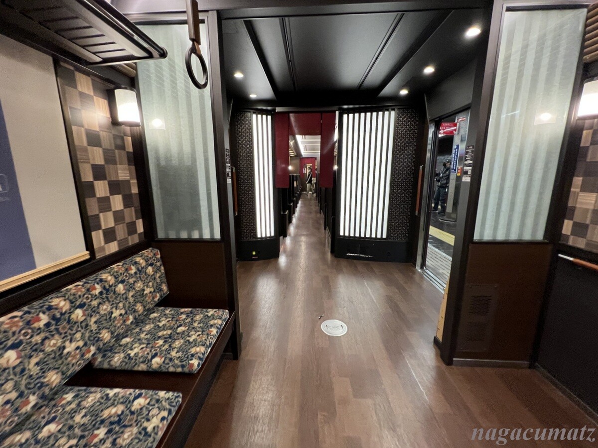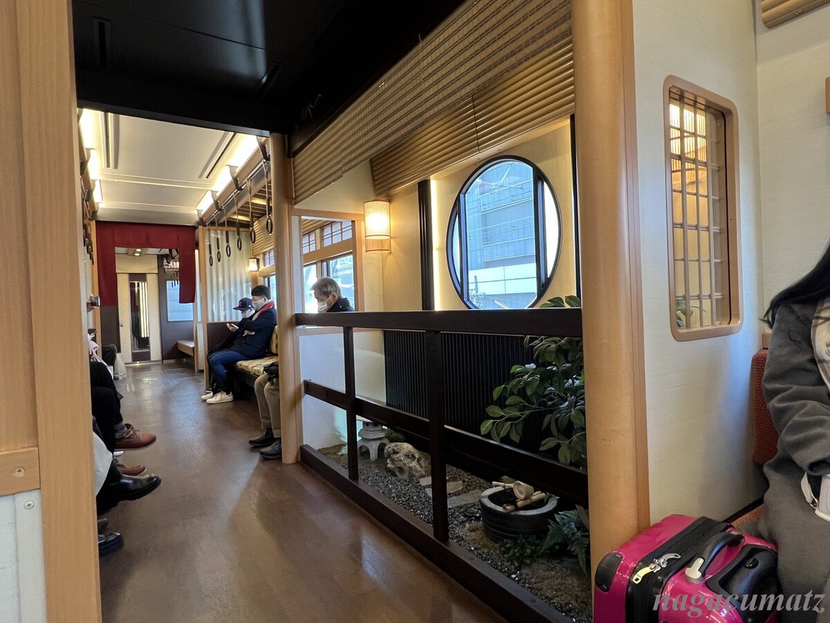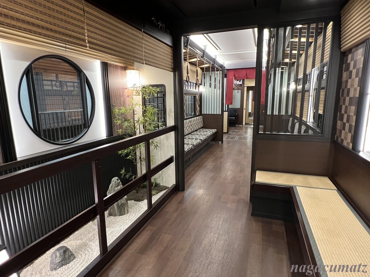 一番驚いたのは車両の中の庭。2号車には「枯山水の庭」、5号車には「京町屋の坪庭」がある。
