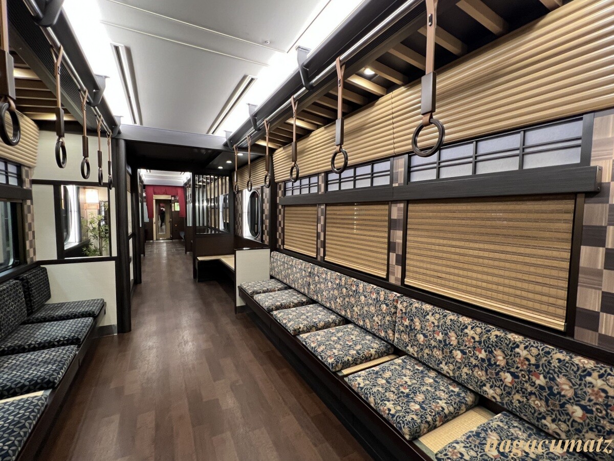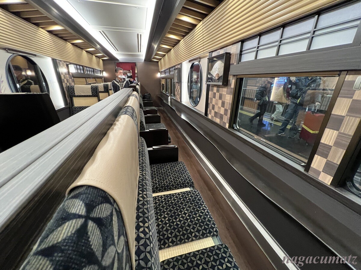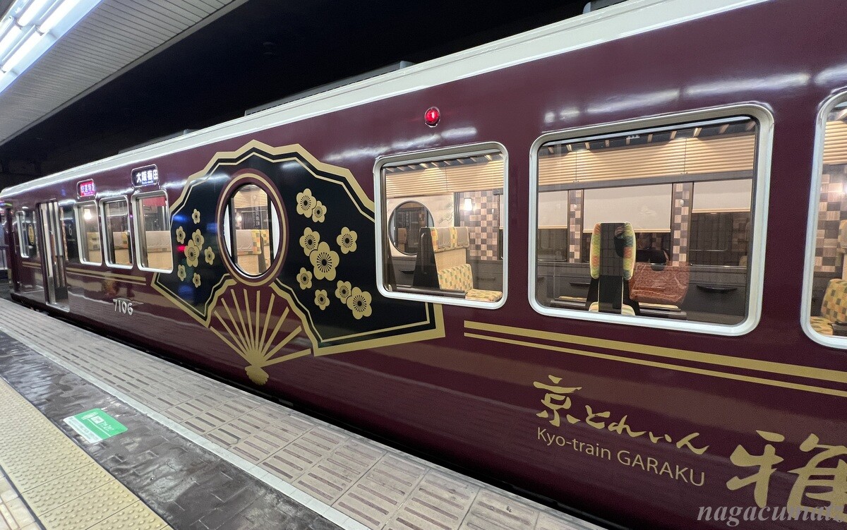 「京とれいん雅洛」と言う列車らしいのだが、土日祝だけ運行されていて、しかも一日 4往復のみとのこと。全く知らずに乗り合わせられてラッキーだった。2011年から「京とれいん」が運行され、2019年からはこの「京とれいん雅洛」も増便されて2本体制だったが、今はこの「京とれいん雅洛」だけになっているとのこと。それまで一時帰国などをしたりしても、車でしか京都に行っていなかったので全く知らなかった為、喜んで写真を撮っている日本人は、今頃になって知った我々ぐらい😂